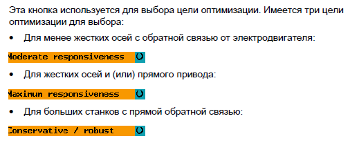 Коэффициент усиления регулятора скорости и положения (коэффициент усиления сервопривода) настраивается на максимальные значения и минимальную прочность. Этот параметр рекомендуется для высокоскоростной обработки с