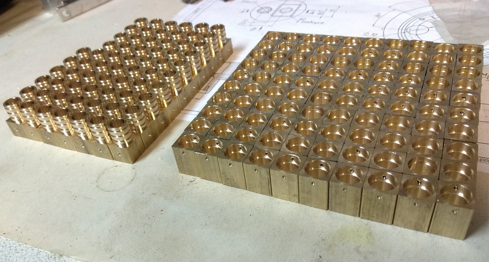 ну собственно вчера станочек закончил работу по первому заказу. сделаны в общей сумме 1.5 тыщи деталек. из них 900 латунь, и 600 ПОМ. ушло на это чисто "станочного" времени 8 дней, по 3 часа вечером. и пара вечеров на всякие "околослесарные" работы - зачистка, сверление, резьбы..