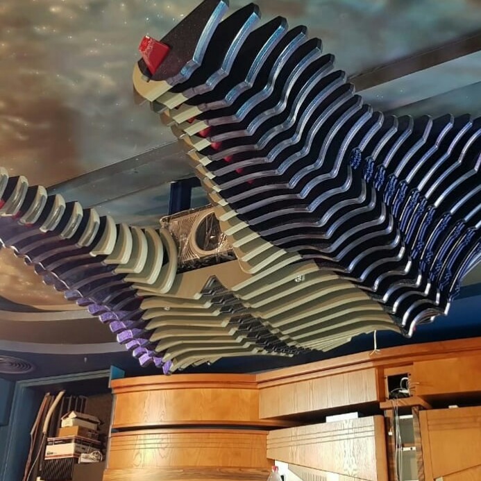 Это не космический корабль... Это домашний кинотеатр. Все подвесные конструкции, декор стен, потолка, мебель, выполнены нашей фирмой и в основном на ЧПУ. В этот кинотеатр были нами разработаны и изготовлены на ЧПУ колонки, ранее опубликованые мною