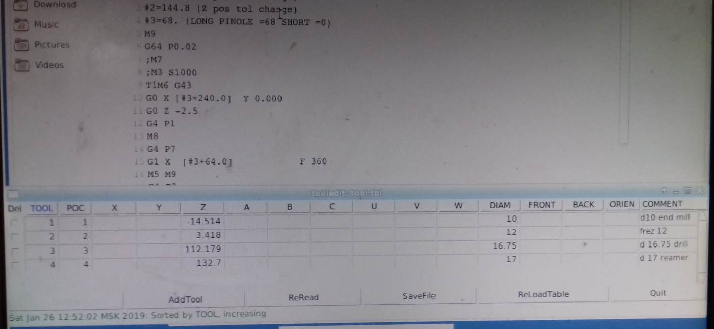 Причём первый инструмент из неё "берёт", отрабатывает с правильной компенсацией по Z, второй инструмент вроде как тоже почти берёт, его оффсеты появляются внизу в окошке, но программа останавливается.