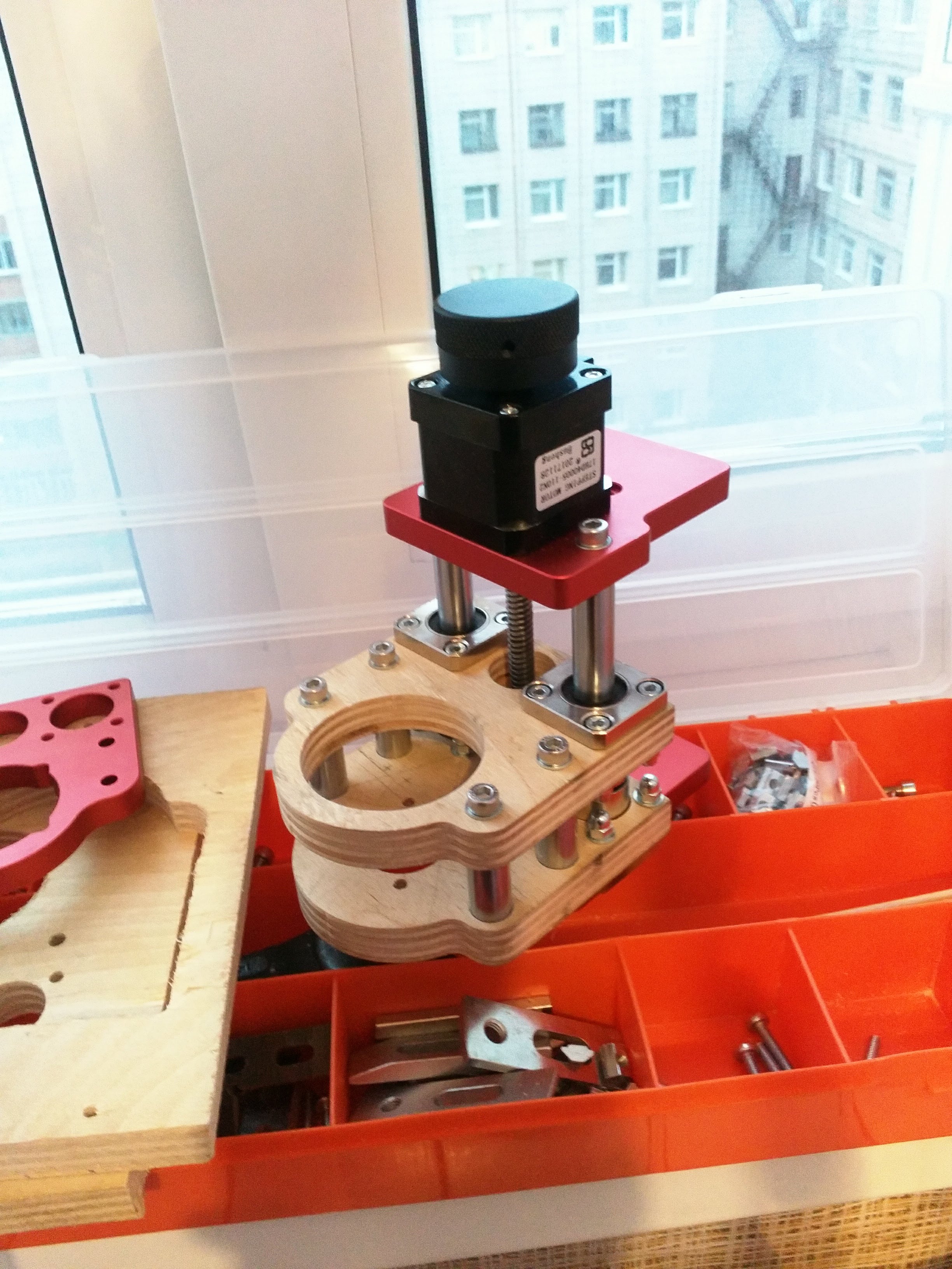 Сделал каретку для шпинделя из фанеры под 53 мм. Так же есть другой проект каретки. Посадочное под шпиндель большое алюминиевое пришло вместе со шпинделем. Собрал по быстрому прототип. Пока еще в дело не пускал. В последнее время занимался увиличением базы. К сожалению попался профиль с внутренним диаметром 5 ((((. Пришлось решать этот вопрос шпильками 5мм. Отрезал по длинне и крепил колпачками.