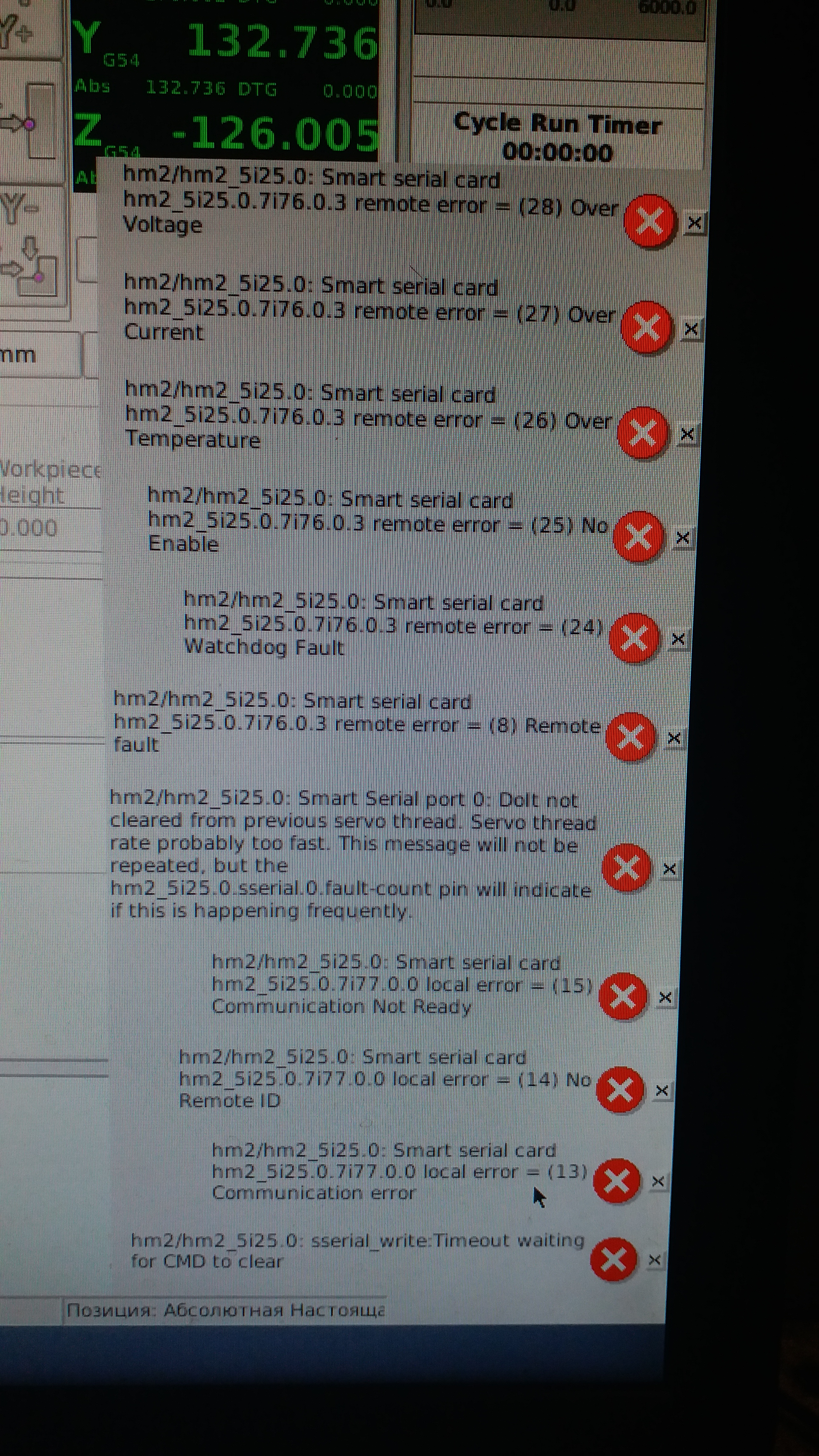 Приветствую. Получилось понять в чем проблема?torvn77 писал(а):Обновил месяц назад прошивку на 7i76 (ссылка на тему) и стали порой сыпаться вот такие ошибки: При чём порой плата просто отваливается и движение станка прекращается. хотя выполнение команд или УП продолжает идти дальше.