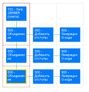 получив контуры платы (модуль 102), делаем 3 отдельных дубликата векторных данных с помощью модуля 500, а далее в каждом модуле №300 настраивает параметры для каждого гравера: