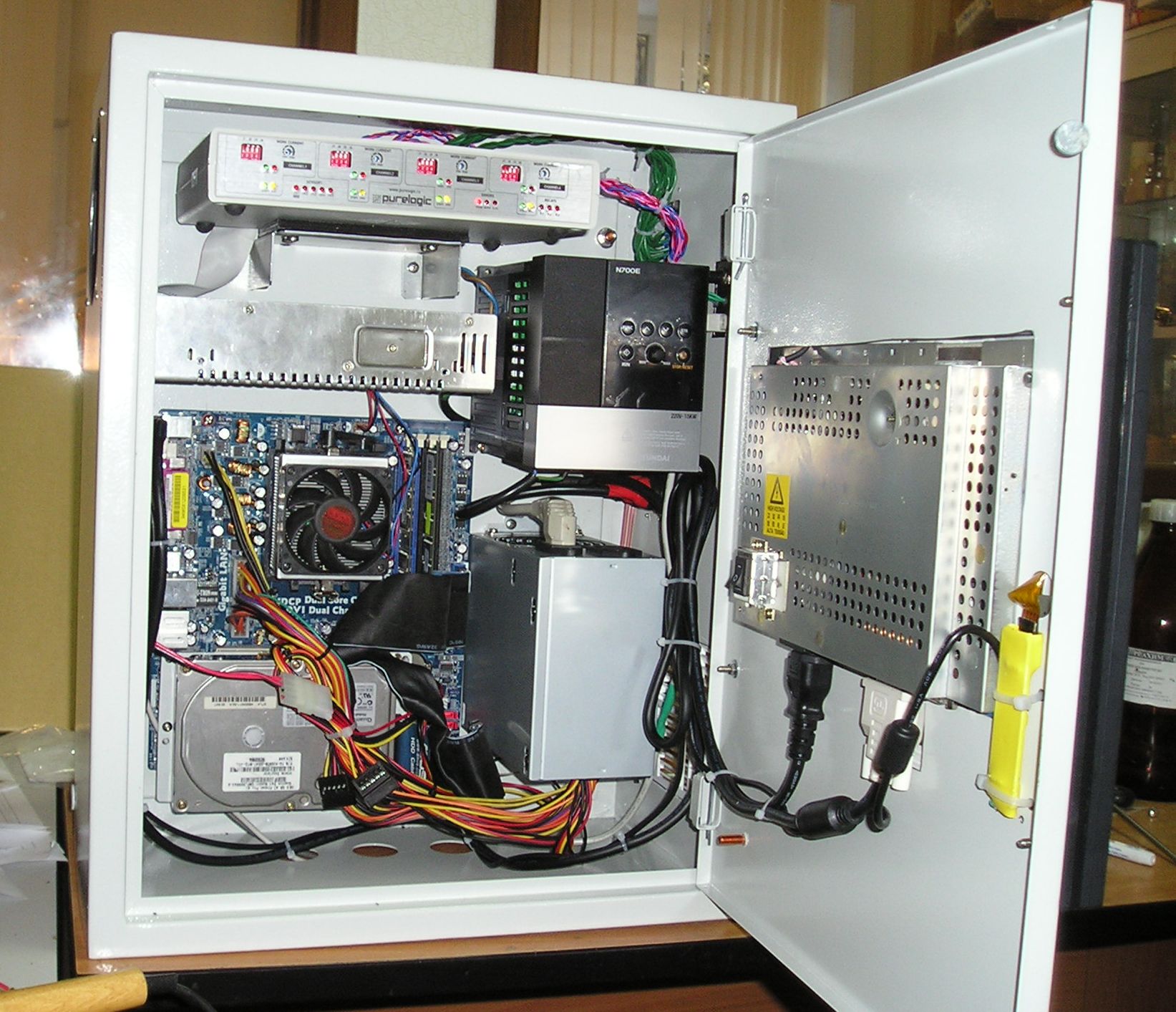 Внутри - контроллер ШД (с запасом взят 4-х канальный), блоки питания контроллера и компьютера, системная плата, винчестер, а также инвертор питания шпинделя (предполагается помимо родного от станка ставить высокоскоростной). Все узлы смонтированы на съемной панели, которая входила в комплект шкафа, поэтому вся начинка ставится и снимается одним блоком. Конструкция внешних разъемов и их крепления предусматривают возможность снятия изнутри шкафа.
