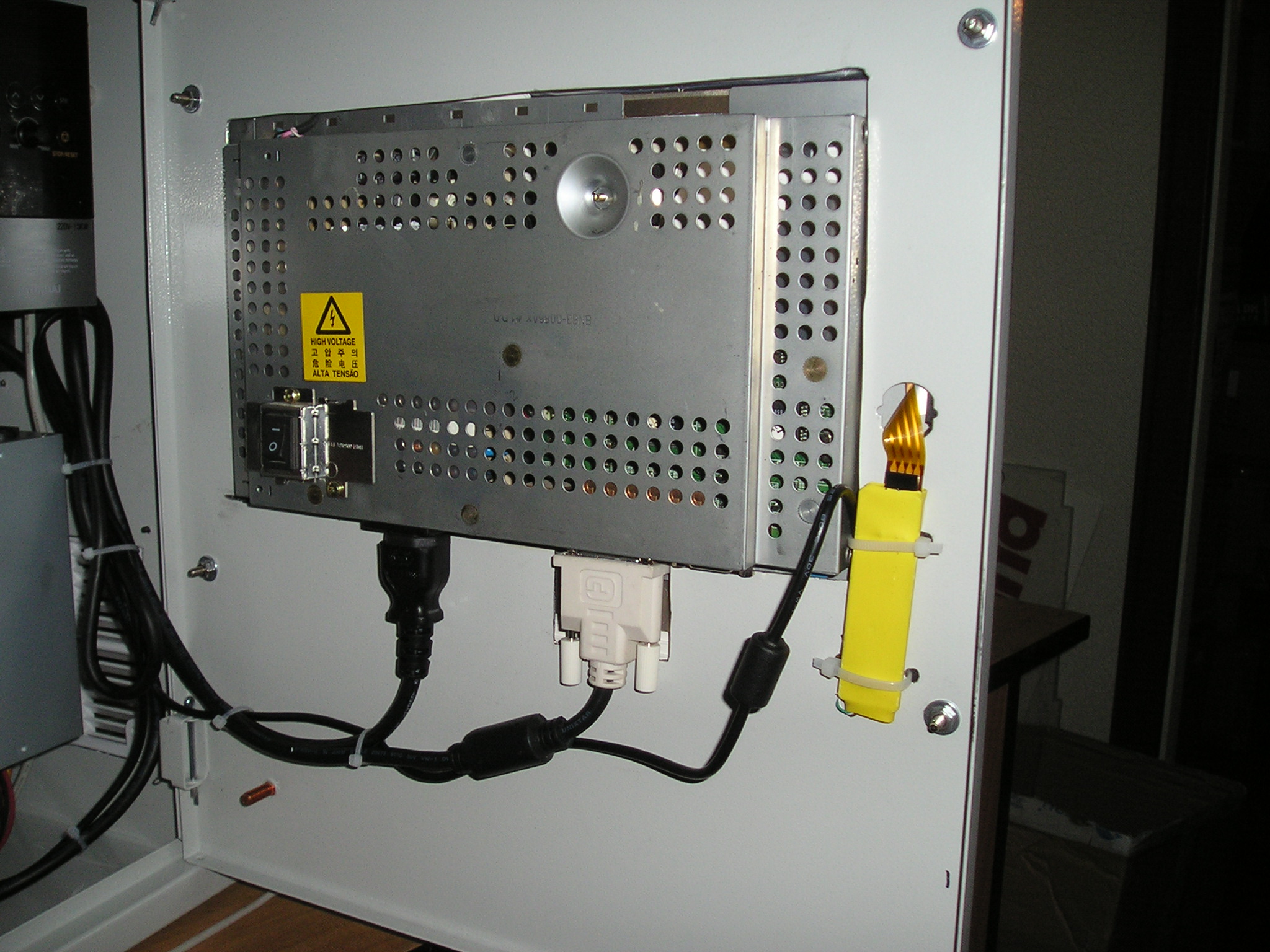Монитор, врезанный в дверцу шкафа. Желтая штучка справа - контроллер сенсорного экрана (23866 просмотров) <a class='original' href='./download/file.php?id=9810&mode=view' target=_blank>Загрузить оригинал (642.39 КБ)</a>