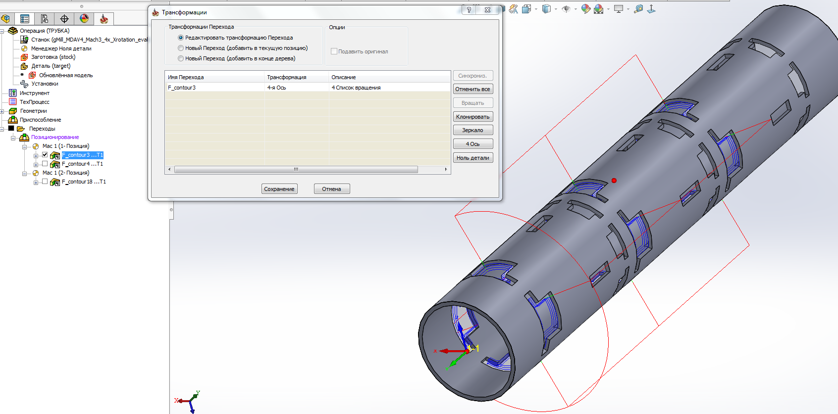 Нужно сделать вырезы в пластиковой трубе - 4 отверстия через 90 градусов. В солиде все проходит хорошо- визуализация делает так как надо. Но при генерации кода и загрузке в MAch3 имеем только 3 отверстия - 4ое отверстие почему то совпадает с 1ым. И так со всем оставшимися отверстиями. В чем может быть проблема? С Уважением.