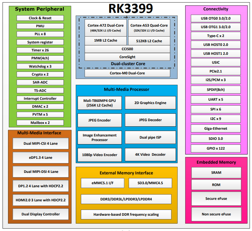 Присмотрелся вчера к чипу Rockchip RK3399. 2 основных процессора - A72: 2 x 2 ГГц, A53: 4 х 1.5 ГГц, 64 бита. 2х-ядерный сопроцессор Cortex-M0! Доки и мануалы в открытом доступе. Есть даже исходники и прошивка для сопроцессора!