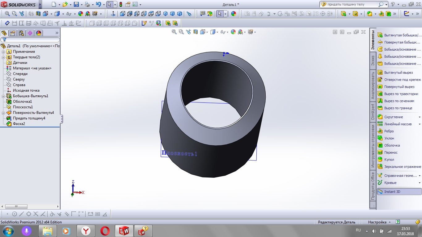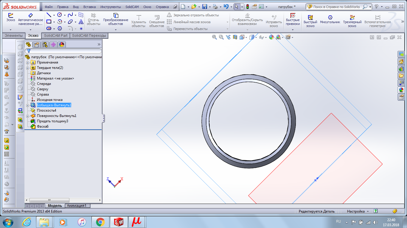 Создаю так сказать саму трубу нужной толщины, делаю необходимый вырез. А вот дальше встает вопрос как это все объединить в единую так сказать фигурную фаску.