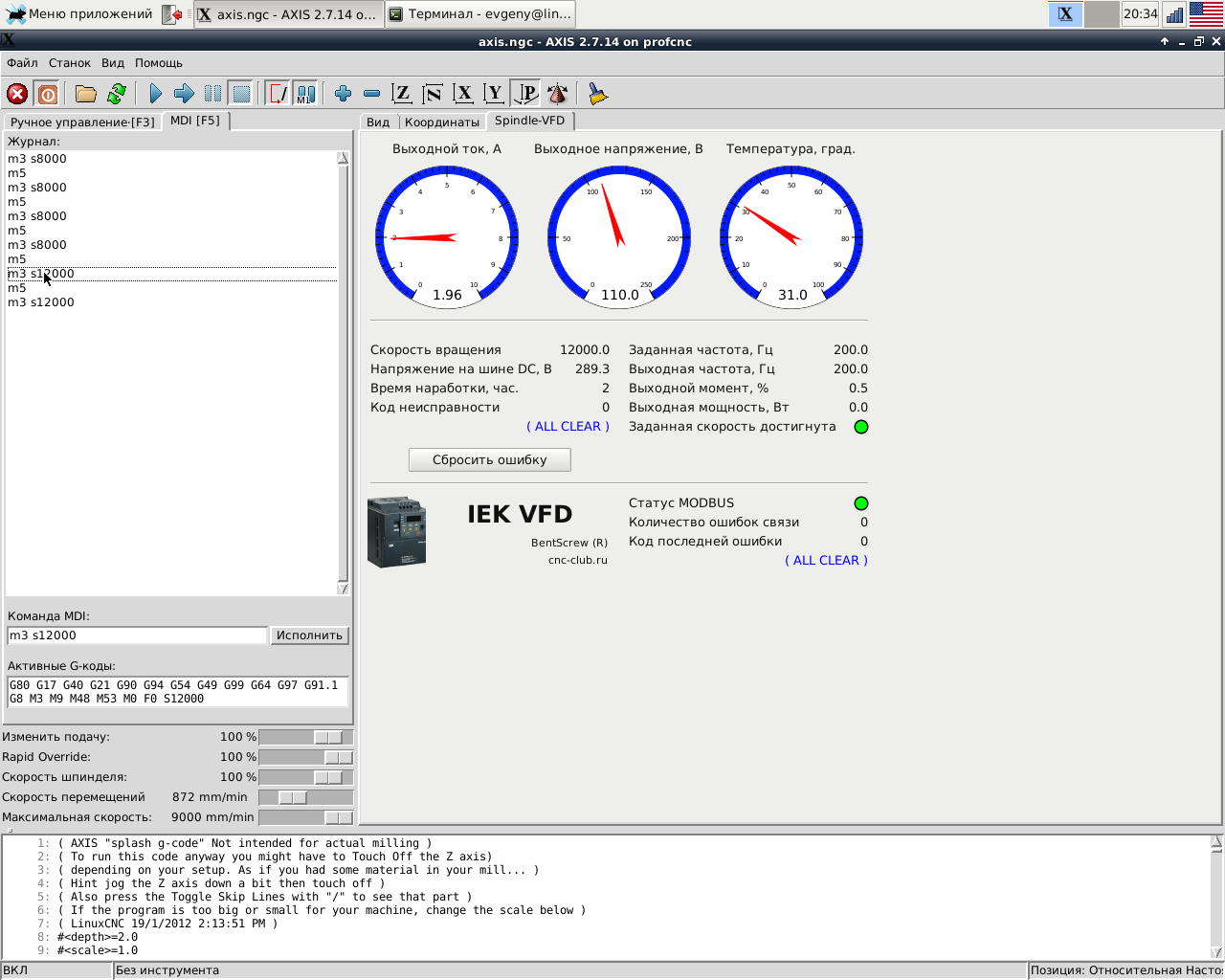 Ничего не заставило. Снятый образ диска с отлаженной ubuntu 10.04+linuxcnc 2.7.14 лежит на всякий случай на большом компе. Экспериментировал с Modbus. На 10.04 Glade старой версии, но и там запустил вкладку управления шпинделем. Сейчас при микрошаге 8 скорость можно до 9000мм/мин получить. Если упрусь в микрошаг или скорость откачусь до Ubuntu.iMaks-RS писал(а):Ты же вроде убунту на D525 водрузил, когда за джиттер боролся.. что заставило вернуться на дебиан?