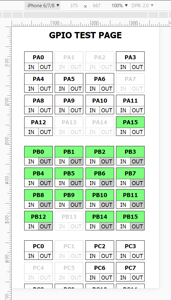 Добавил простой модуль управления GPIO. Для быстрой проверки пинов запилил веб страницу, где показано состояние и тип всех пинов в реальном времени. Стессна, насколько это возможно в границах веб технологий. Менять тип и состояние пинов можно прям на этой же странице. Проверять датчики, кнопки и модули реле - самое оно. Если на странице видите какие-то косяки или что-то непонятно, пишите. Функционал модуля GPIO буду расширять, чтобы дополнительно можно было менять тип выхода (push-pull, open-drain), скорость (4 типа) и подтяжку (к питанию или земле). Соответственно, веб страница тоже будет доработана.