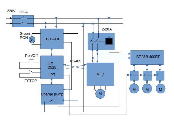 Алгоритм работы следующий - при автозагрузке ПК и автозапуске LinuxCNC активируется компонент charge pump который генерирует меандр на определенной ноге LPT порта. Специальная схема отслеживает появление сигнала и включает контактор, который в свою очередь подает питание на частотник и БП драйверов. В случае зависания ПК или закрытия программы, контактор размыкается. Так же на драйверах будет задействован сигнал ENABLE. В случае аварийного останова питания на двигателя снимается.
