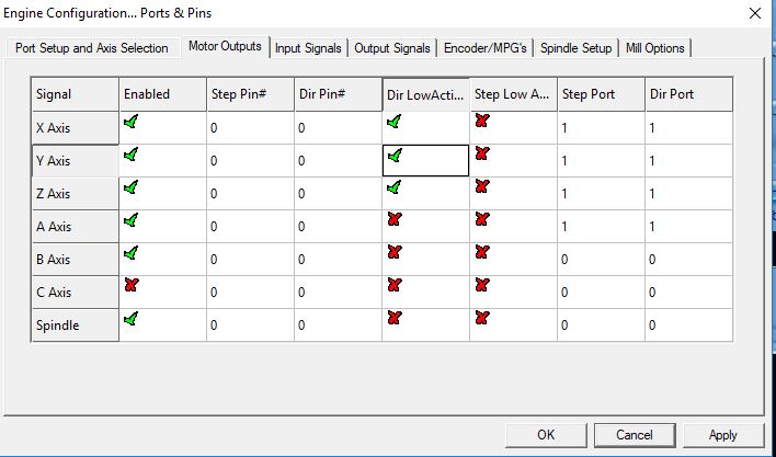 Здравствуйте ЛЮДИ. Есть вопрос, хотя и не совсем по теме. Подключаю 4 и 5 оси к StepMaster - 4 ось работает, а 5 - не в какую. Стал проверять потенциал на 16 и 17 пинах кабеля (согласно инструкции StepMaster) . На 16 - 0v, на 17- 5v. При управлении с клавиатуры эти сигналы не меняются при том что, на экране Mach3 координаты и скорость оси меняется. Пробовал менять местами пины 4 и 5 осей .На 4 оси 16 и 17 пины работают, а 8 и 9 - на 5 оси нет. Т.е. проблема явно с 5 осью. В MOTOR OUTOUTS всё астивированно. Может есть ещё какие-то птички которых надо отметить?