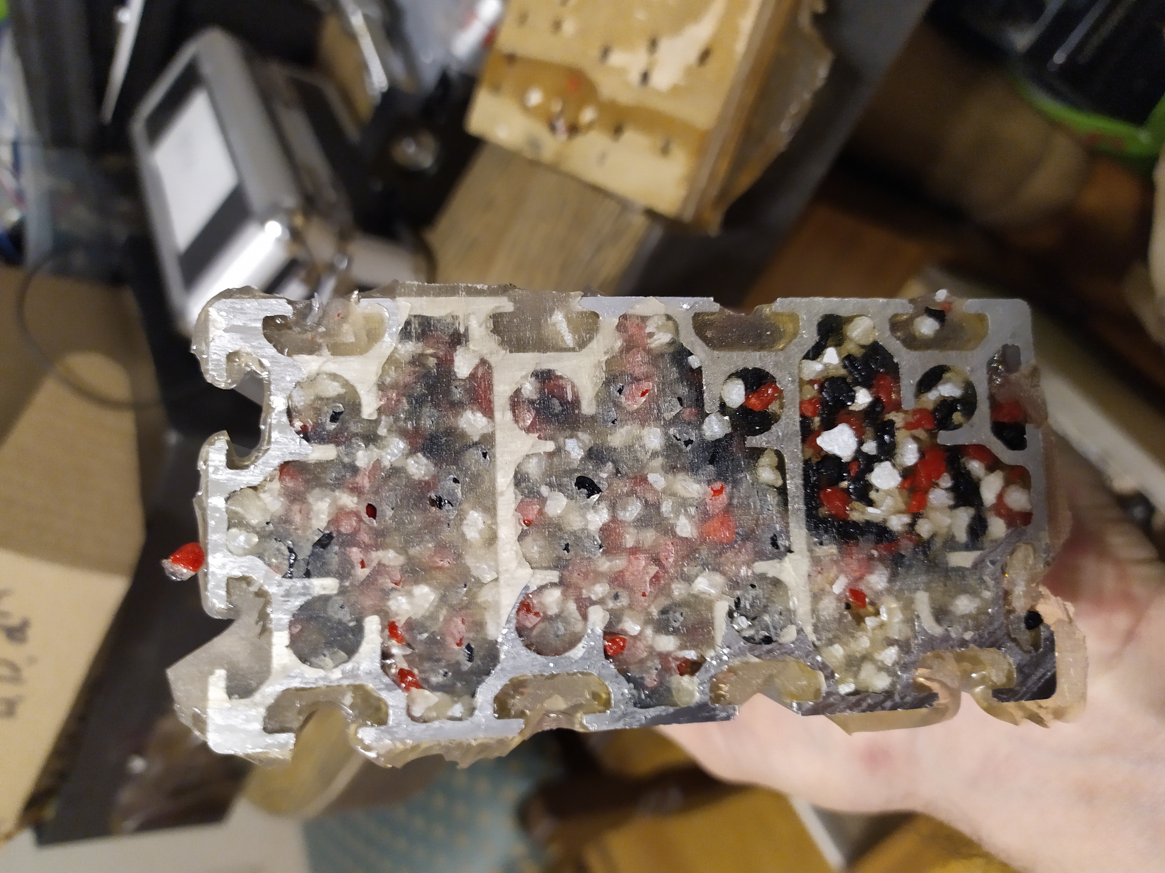 Вообщем, в этот раз все прошло на ура. Остались только вертикальные стойки портала. Но я их буду заливать не отдельно, а после установки на станину. Чтобы полимер гранит схватил станину и приклеил ее к вертикальной стойке. Понятно, что конструкция получится не разборная, но прочности будет имхо побольше.