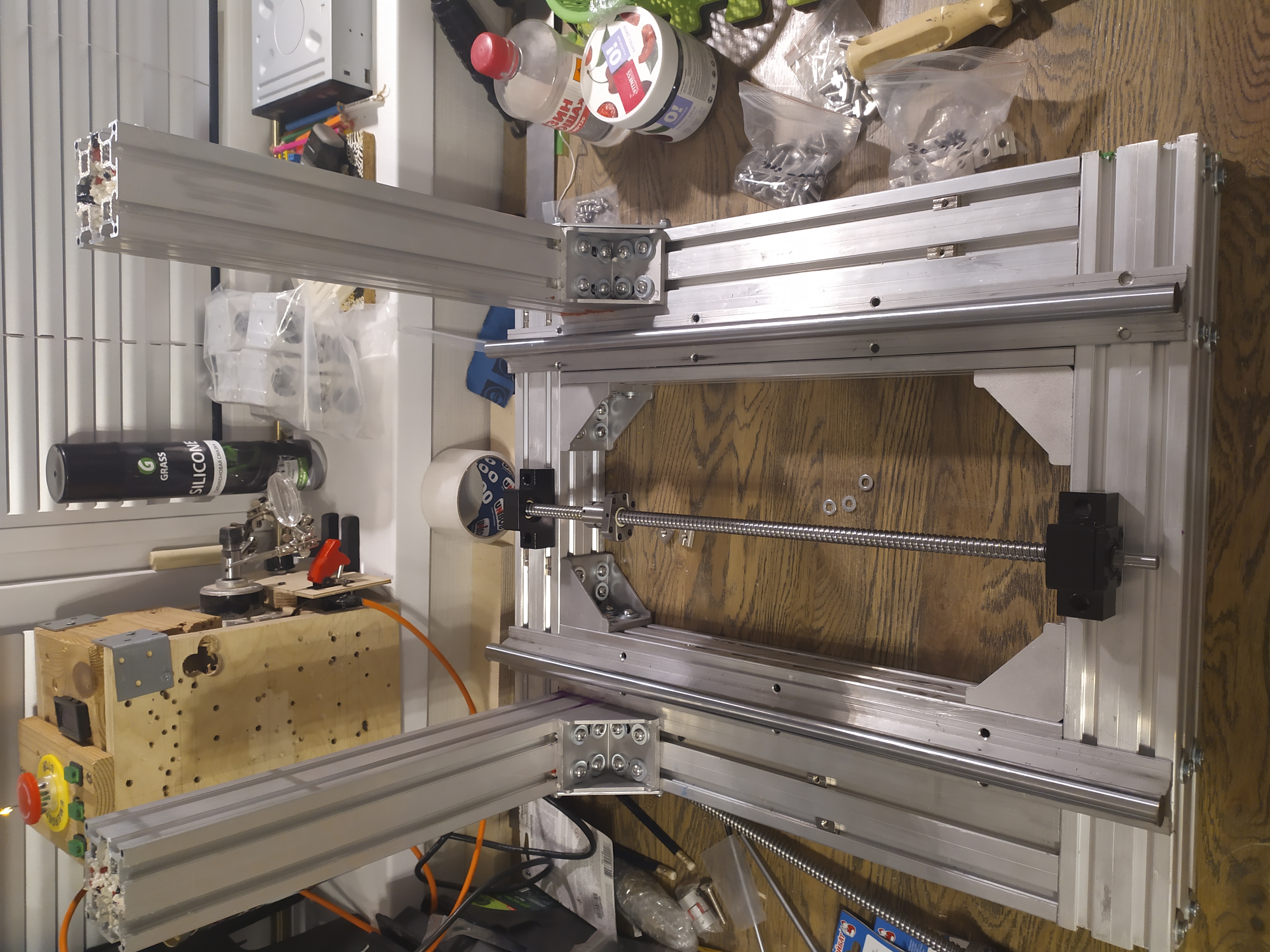 Залил таки я полимер бетоном последнюю пару профилей (вертикальные). Так как все части рамы залиты, начал сборку. Ось X выглядеть будет так К сожалению, сильно просчитался с сухарями, видимо придется заморозить сборку, пока не прибудет партия сухарей