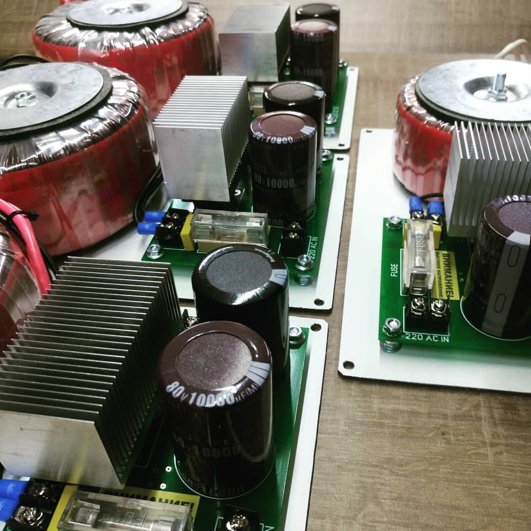 Если требуется готовый линейный БП, то к цене +2000руб. Сюда входит плата с диодным мостом до 50А, конденсаторы общей ёмкостью 20000мкф, защита от КЗ, силовые дорожки дополнительно лудятся до сечения ~4кв.мм. Каждый БП представлен в открытом варианте с размещением всех компонентов на индивидуальной монтажной площадке. Если нужен особенный конструктив - обсуждаемо. Использую только качественные комплектующие с обязательным входящим контролем.