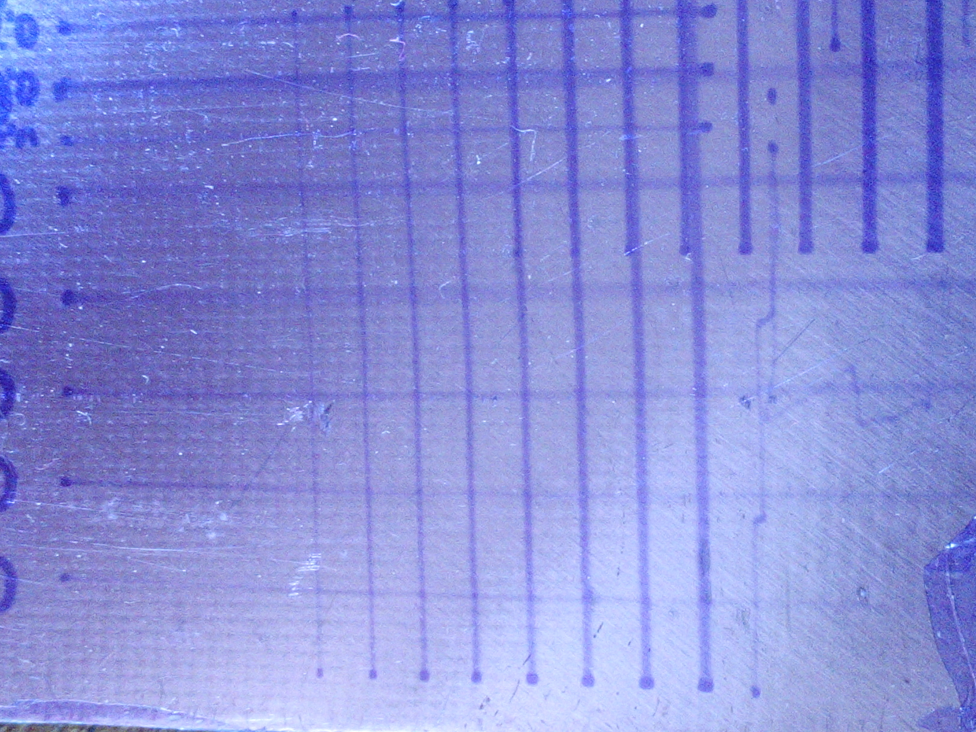 Может кому то полезно будет-для более четкого очертания краёв дорожек, полигонов и пр. перед засветкой лазером нужно снять защитную пленку с фоточувствительного слоя, она хоть и не много, но рассеивает. По ходу экспериментов родился вопрос: как заставить рисовать в обе стороны, чтобы оба прохода были полезными, а не возврат?Эта плата нарисавана в LaserGRBL3.0.9 с проходом по вертикали, по горизонтали обнаружился какой-то косячок с механикой, в одном месте заметна легкая кривизна линий. Потом ровно идёт, потом снова такая же кривизна и так равномерно...При засветке по вертикали такого эффекта нет, может шаги по Х уходят,(отсюда ещё попутный вопрос: реально ли прикрутить энкодер?) может ещё что, нужно вычислять...