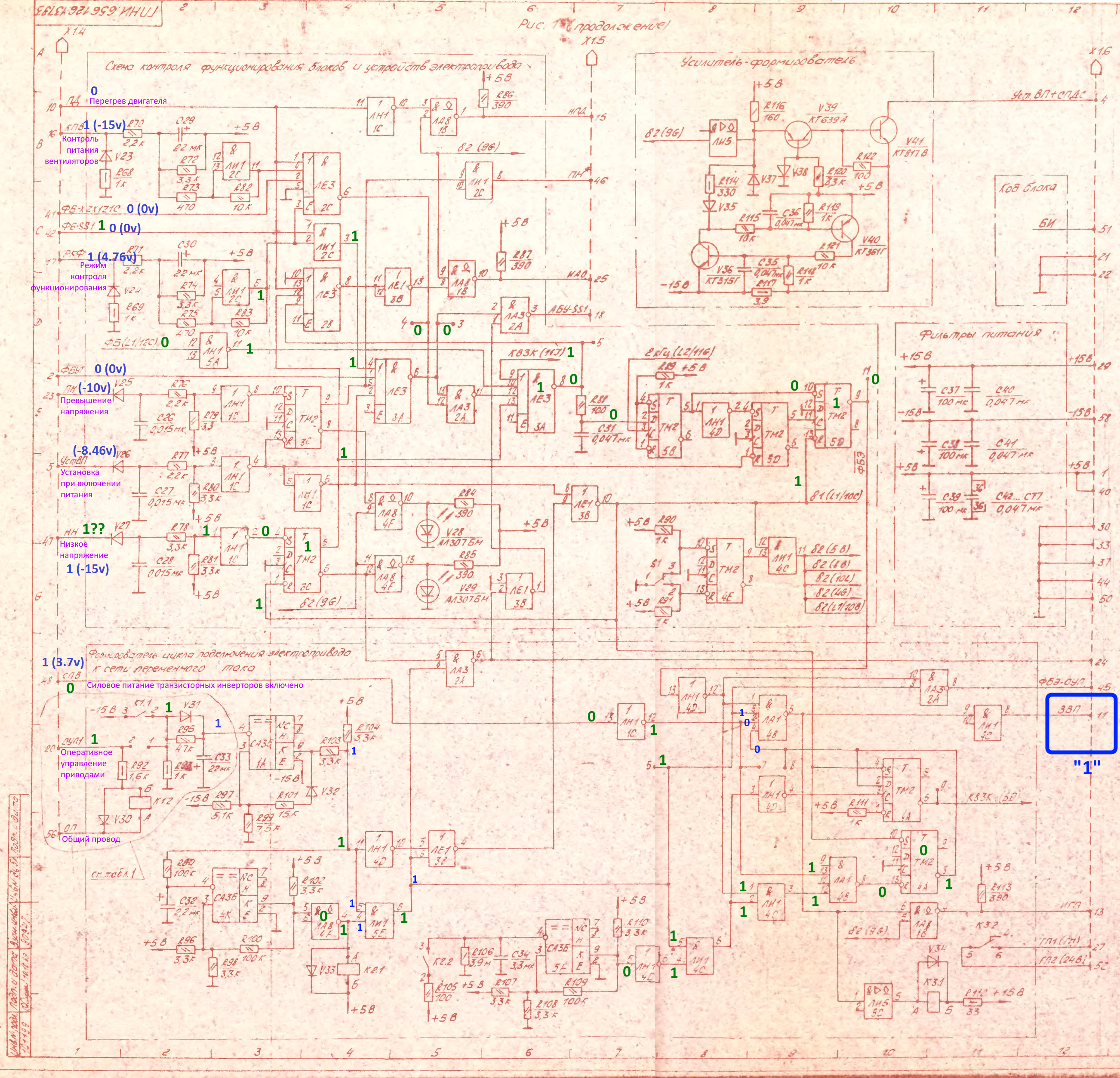На контрольной точке с одной стороны платы ДОС2 написано "5", на другой стороне "6". Оказывается я смотрел не на той точке. В итоге: ОУП приходит в плату ДОС2. Не хватает остальных трёх сигналов. Из них один меня смущает: по схеме для разрешения включения приводов сигнал СПВ (Силовое питание транзисторных инверторов включено) - должен быть = "0". Фактически приходит сигнал "1" (3.7 Вольт).