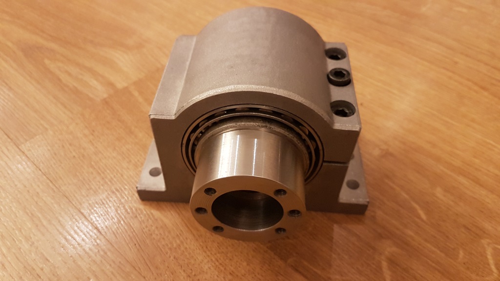 Корпус буду делать сам, покупной (80мм кронштейн от шпинделя) тоже подходит. По ощущениям, соосность - вообще на высоте, подшипники ходят очень легко. Конструкция внушает доверия. В центре отверстия для смазки через пресс-масленки. В центре обоймы есть паз, при помощи которого можно болтами через корпус гайки обойму мертво расклинить - застопорить...