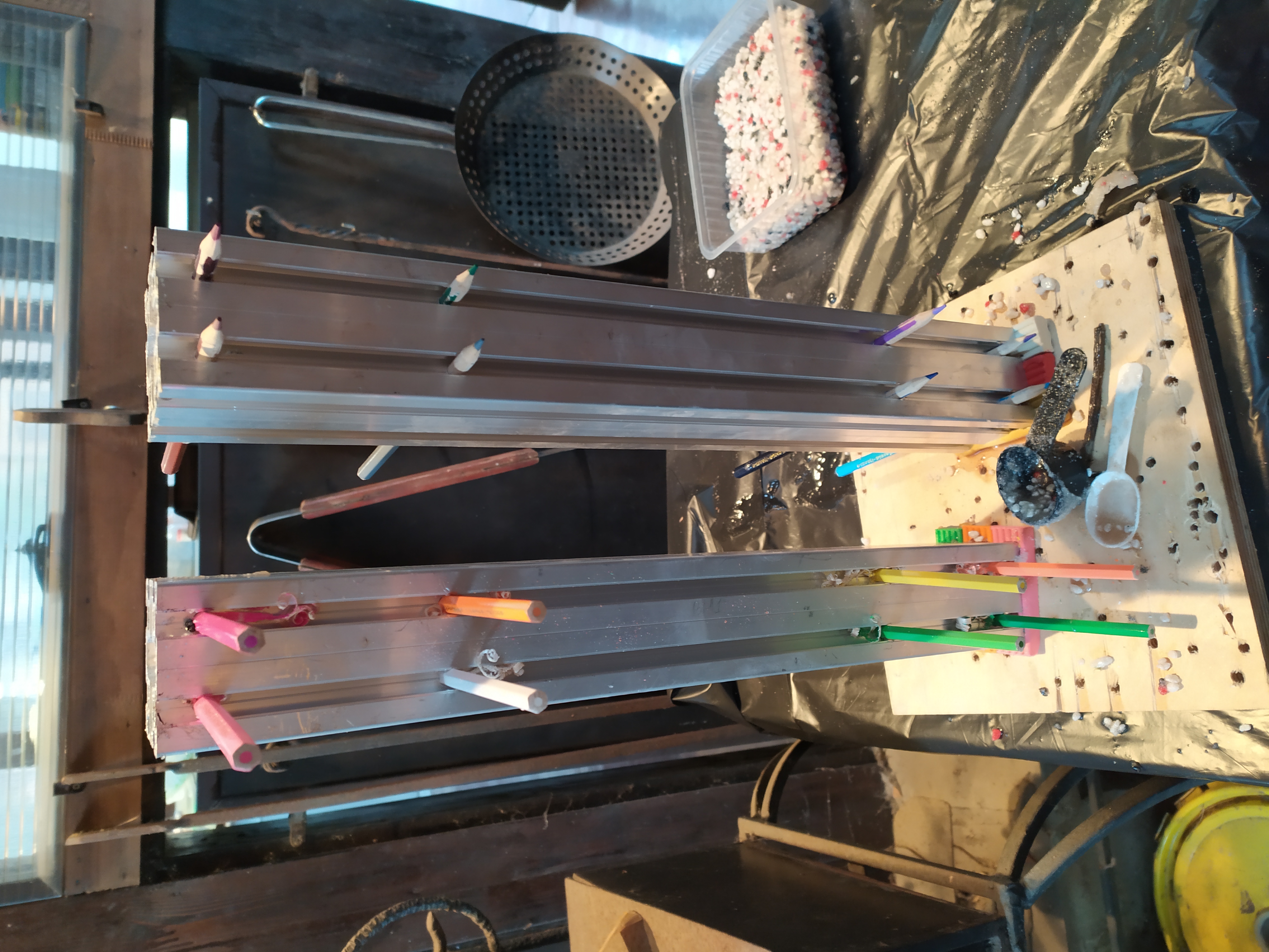 Для этих целей отверстия в 6мм рассверлил для 6.5 и вбил детские цветные карандаши Каляка-маляка. Они отлично справились с задачей. Особенно весело было их высверливать, весь пол в разноцветной пыле от грифеля. Такая радуга на полу.