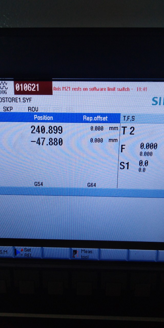 Здравствуйте. Токарный китаец. Стойка Sinumerik 808D. В программе обработка наружной поверхности, торцовка, сверление. Проточил и торцанул нормально, но по Z не досверлил. На следующей детали выясняется, что 0 по G54 уехал в право на 36мм. Ладно, исправили, запускаем программу — ошибка: мол выезжает за концевик. В режиме JOG еду к патрону, и не доезжает 40мм ибо стоит на концевике.
