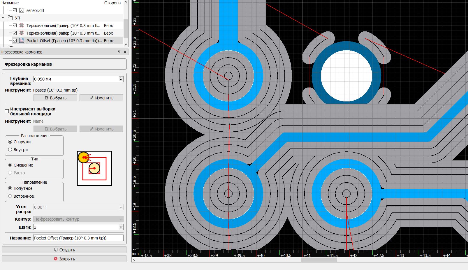 Здравствуйте, сегодня сделал платку с помощью G2G и заметил еще один не очень приятный нюанс. Скриншот приложил. Суть в том, что программа не учитывает предыдущую траекторию и другие пятаки при выборочном генерировании траектории кармана. Инными словами когда я делаю сначала земляные пятаки с термоизоляцией, а потом дорожки, то траектория дорожек порет пятаки. Можно как то етого избежать?