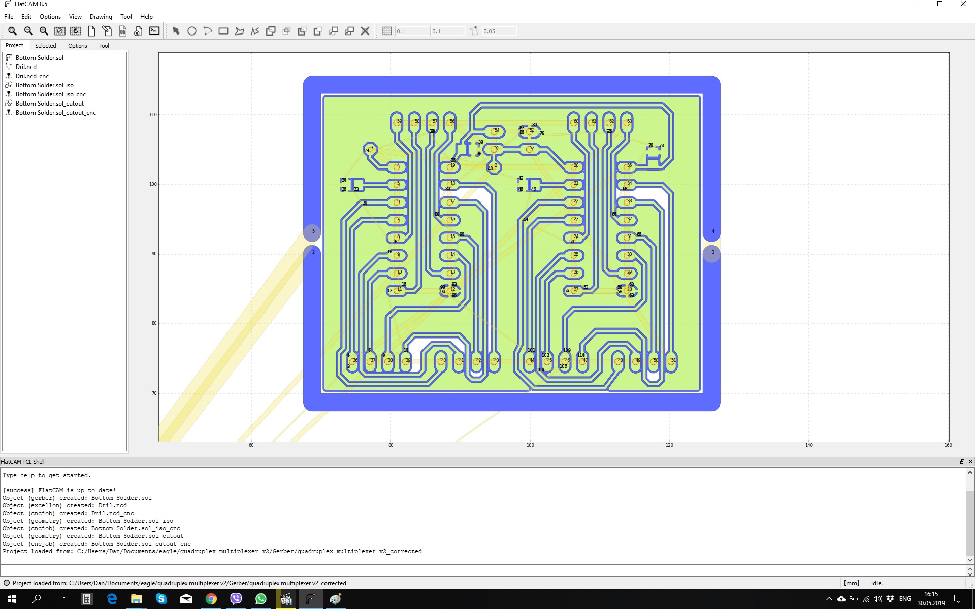 Вот так выглядит загруженный гербер во FlatCAM_8.5 со всей геометрией и траекториями (офсетом перемещал координаты, что бы гравировать на столе, где прикрепил текстолит).