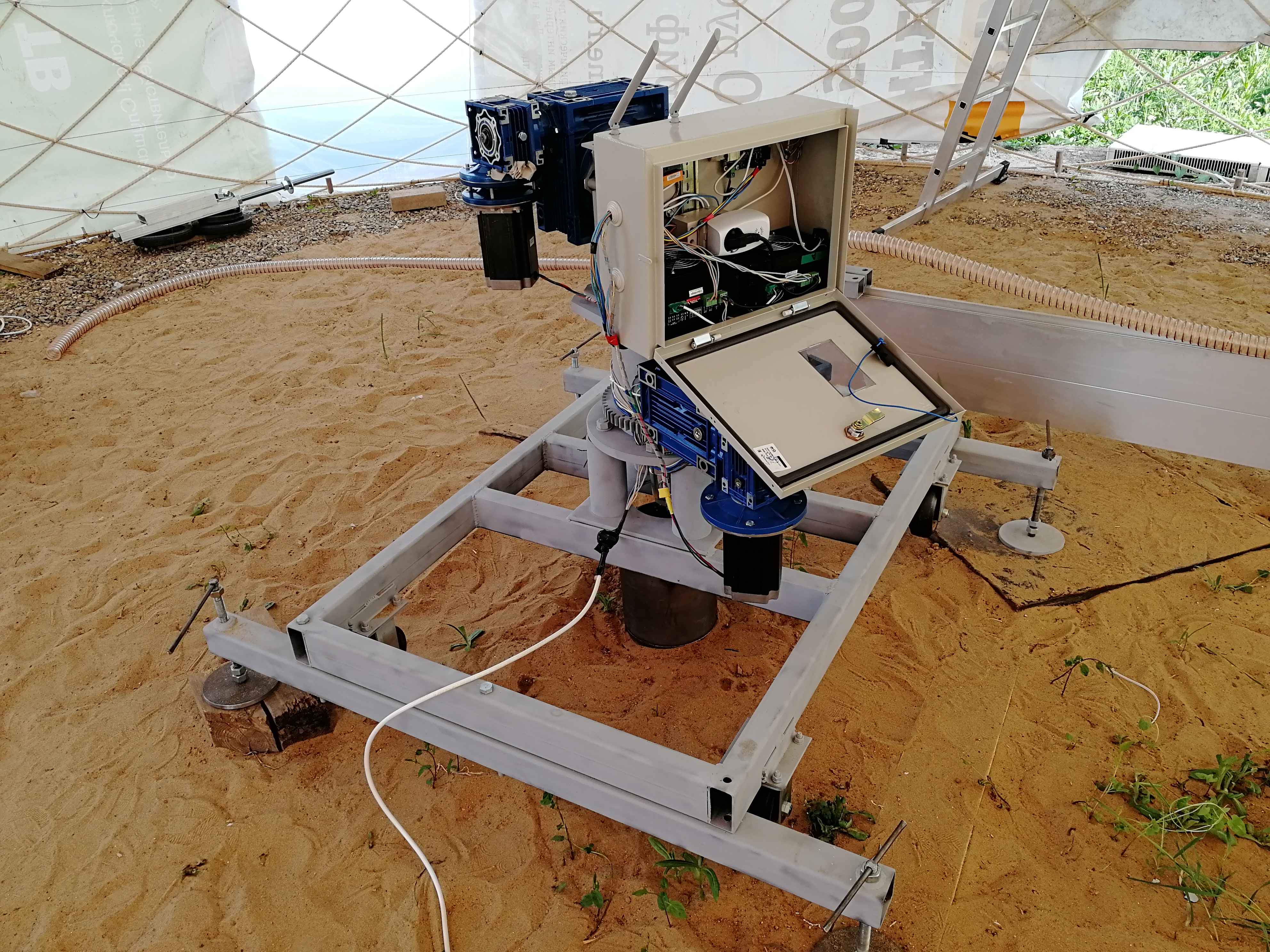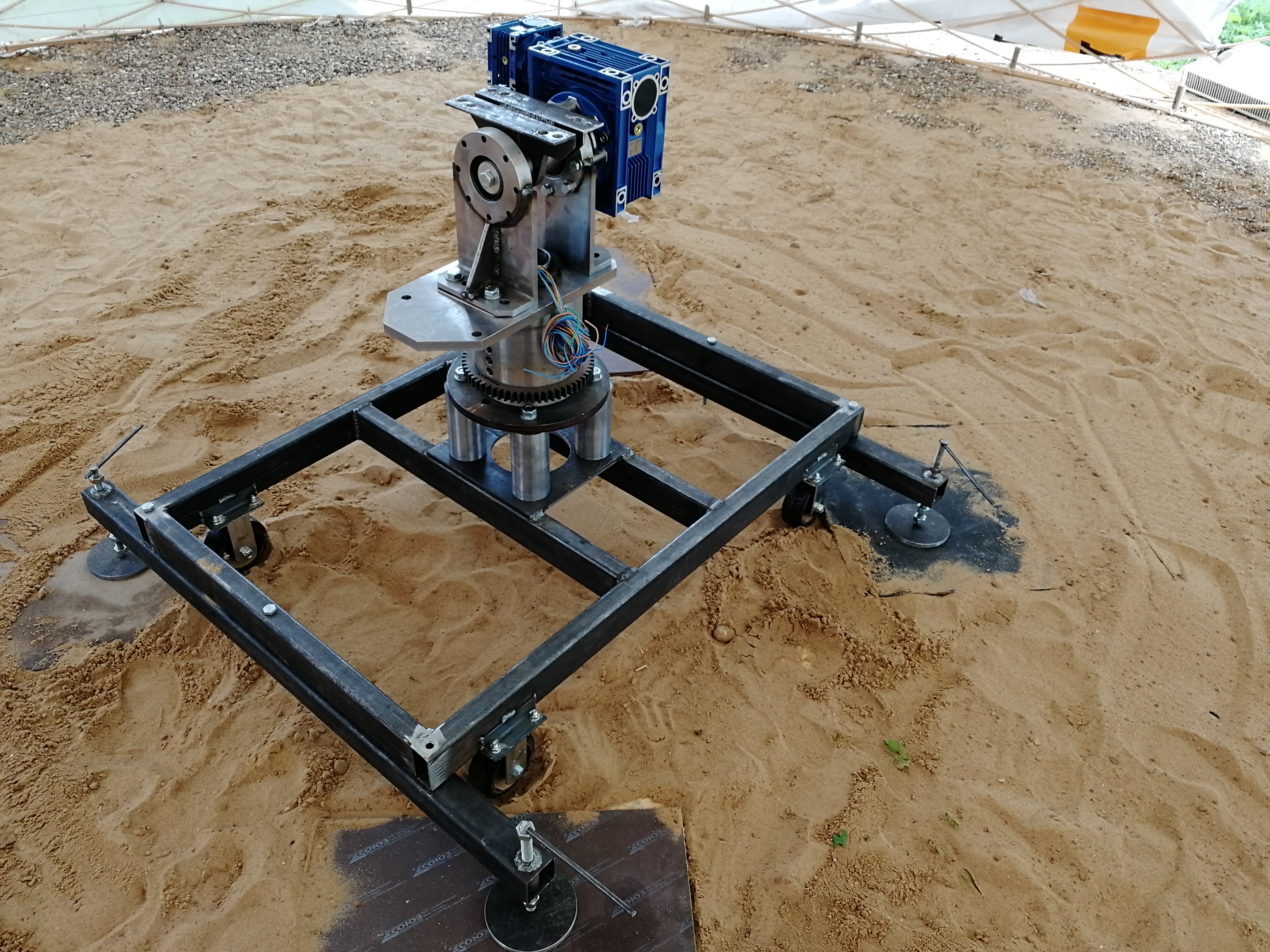 Надо бы площадку-плиту под тележку из твердого материала и тормоза на колеса. Иначе или на колесах не устоит - укатится или провалится в песок один угол и вся работа насмарку.