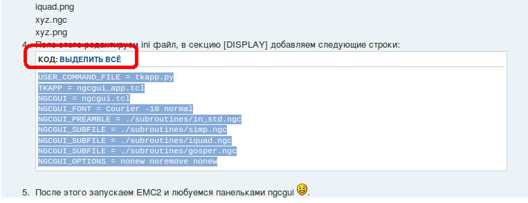 Файлы из 3-го пункта можно класть в любое место. Главное правильно указать к ним путь в ini на 4-том шаге. Относительный путь указывается относительно ini. Т.е. если файлы лежат в том же каталоге то нужно написать, например, ./iquad.ngc . "./" означает каталог в которым мы находимся.