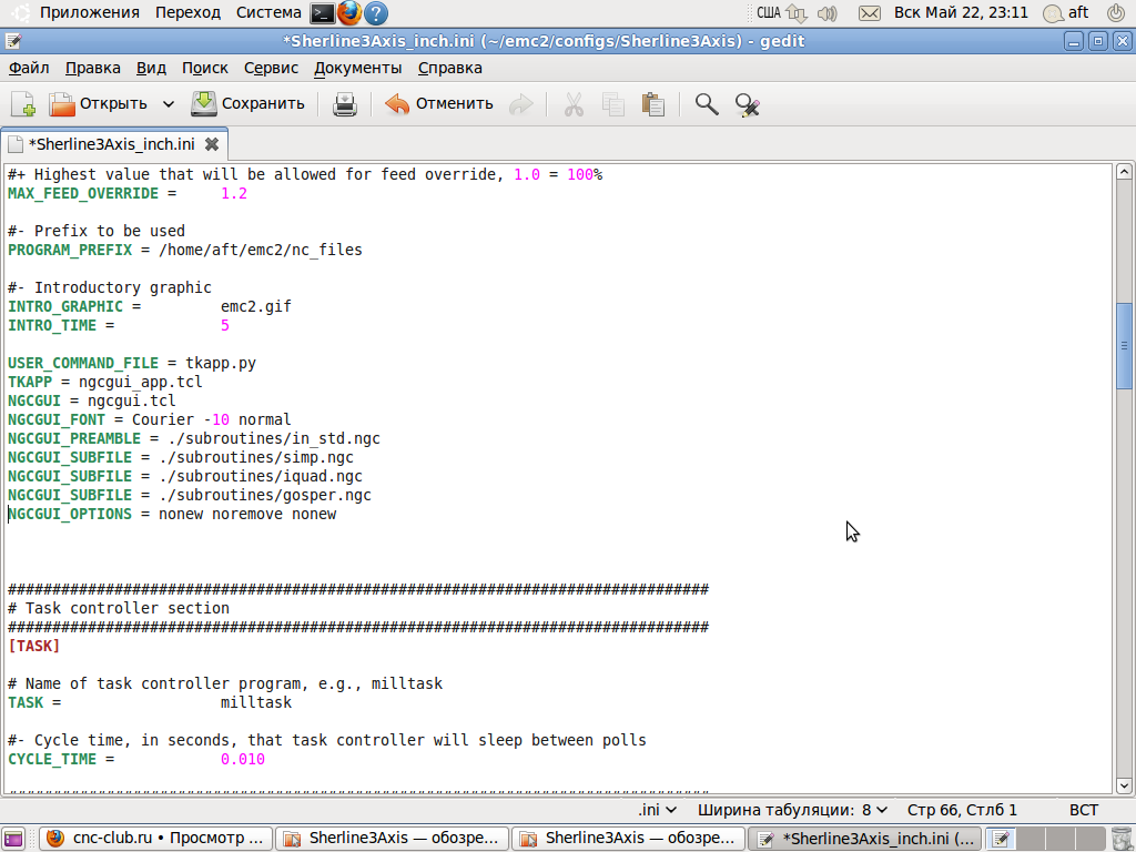 после чего появляется папка /home/aft/emc2/configs/Sherline3Axis