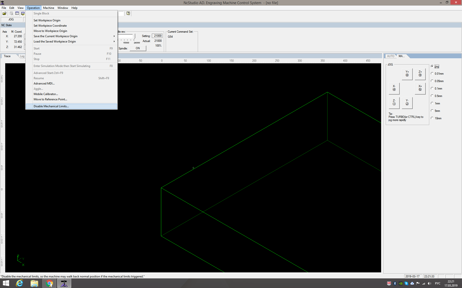 Сохраняю.открываю NC studio выставлю на ноль, далее калибрую, открываю файл и программа загружена, но после плэй, станок начинает рвать в середину рабочего поля и чуть ли не пробивает мне алюминиевую станину, успеваю остановить экстренно.
