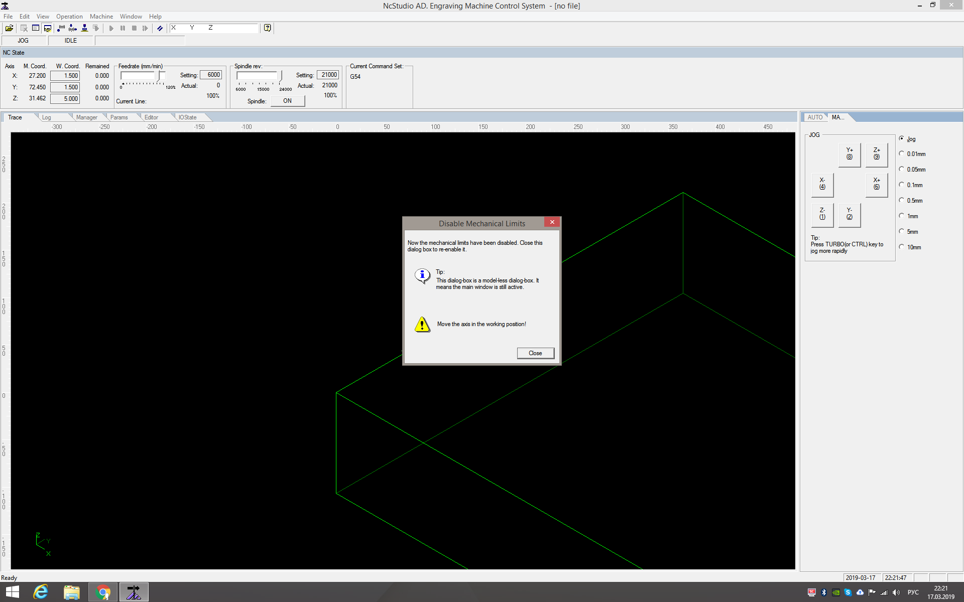 Запустил программу ns studio на своем станке в третий раз, как бы это было не смешно за почти 10 лет после приобретения, вручную перемещая по оси Y , дошел до края и станок замер, на команды не реагирует, шпиндель не запускает, загорелся красным концевик, программа на английском, как снять ошибку не знаю, поэтому и пишу.