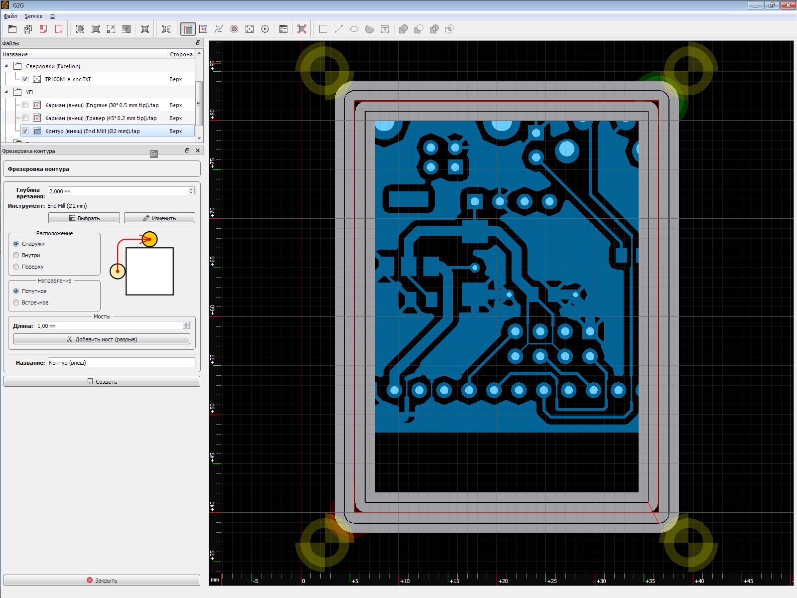 Может я что не правильно настроил, или что-то недопонимаю, но при фрезеровке по наружной части контура платы G2G проходит фрезой и по внутренней части.