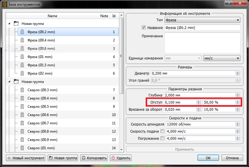 в обоих случаях - гравер 0.2мм 60 градусов.