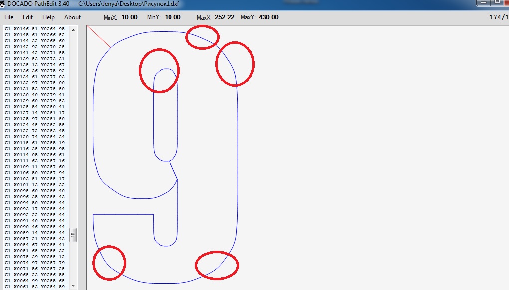 Понимаете, проблема в том что корел сохраняет все хорошо, я проверял он точки расставляет хорошо. А после конвертации в докадо вот такие косяки появляются.Евжений писал(а):Пока не подошёл специалист по Docado Path Edit 3.40, могу посоветовать попробовать добавлять вершин в кореле перед отправкой в dxf.