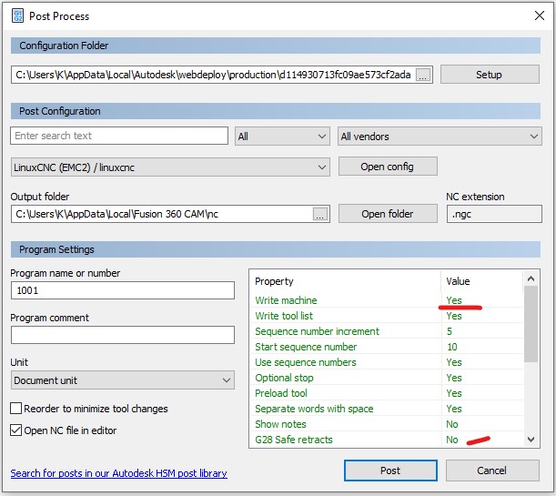 Вот для примера уходить в g28 или нет вставляется одной галочкой при выводе программы. Так же там конфигурация машины полностью описывается в меню, и естественно если заполнить, эти настройки передаются постпроцессору, и он уже не поедет в нули, а туда где записана хоум позишн...