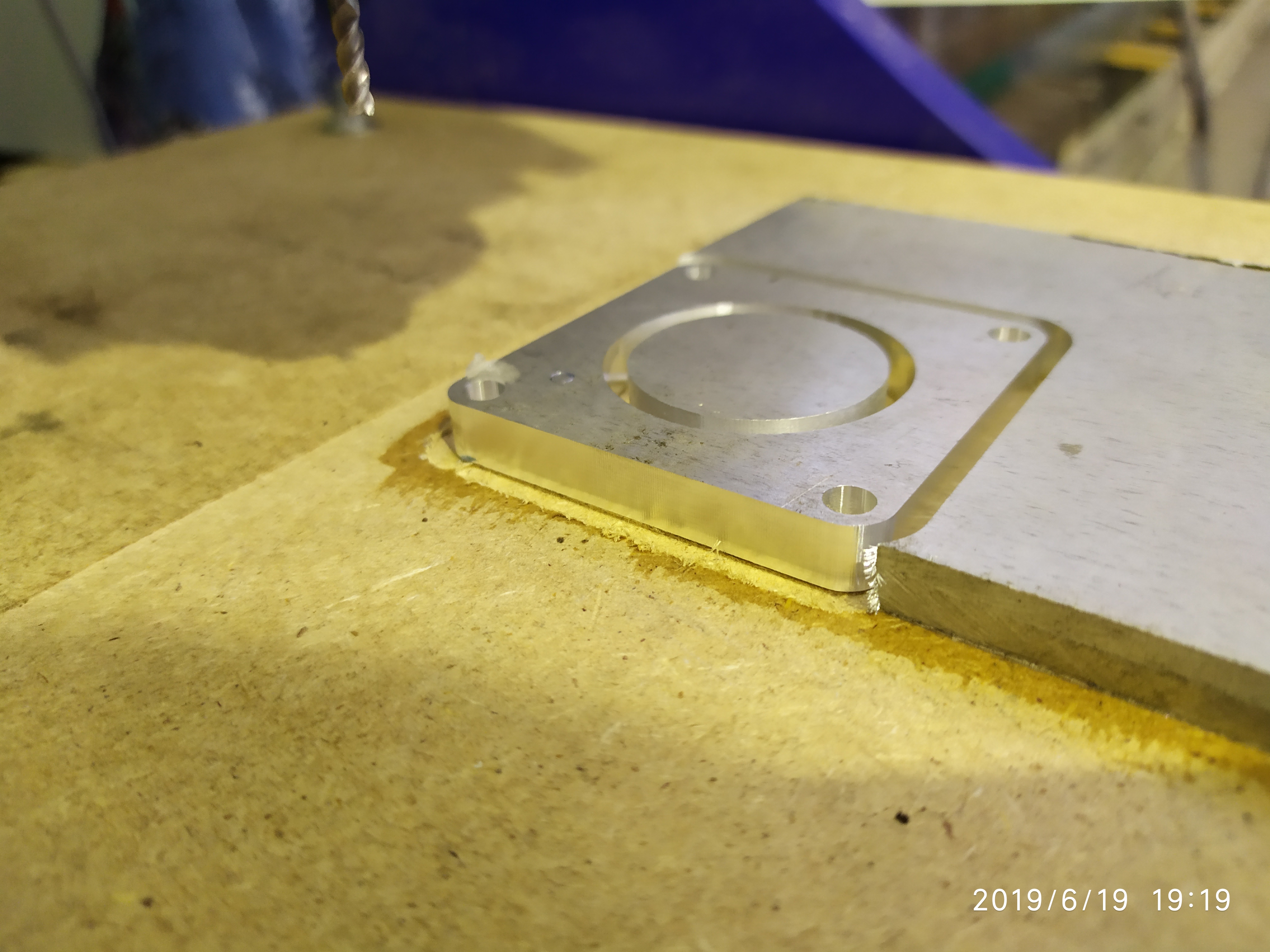 Сегодня делал очередную проставку под двигатель. Учел предыдущий опыт и советы форумчан. Изменил режимы и направление реза. Сделал припуск на последний проход всей режущей частью фрезы. Результат превзошел мои ожидания. Деталь еще не снимал. Заготовка приклеена на цианакрилат (космофен). Завтра буду еще одну пилить и прижимы. Торец по сравнению с первой намного чище.Фреза 3мм 3 заходная, обороты 15000 подача 1400мм/мин съем 0.15 попутно. СОЖ не использовал, продувал воздухом.