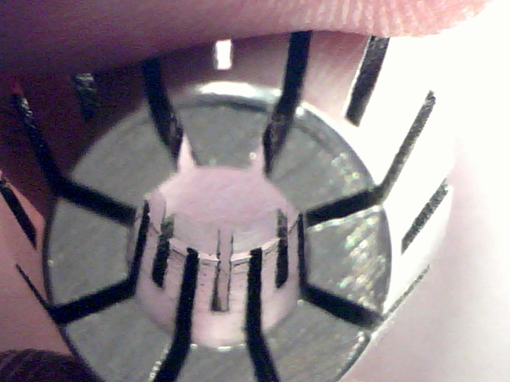 Вот как выглядит цанга, если в неё всякую хрень зажимать короткую. в уступ тот даже фреза номинального размера упирается, и дальше нужно силой заталкивать. Судя по тому что отпечатывается именно кончик хвостовика - цангу таки перекашивает конусом. Но об этом и в мануалах картинки есть.
