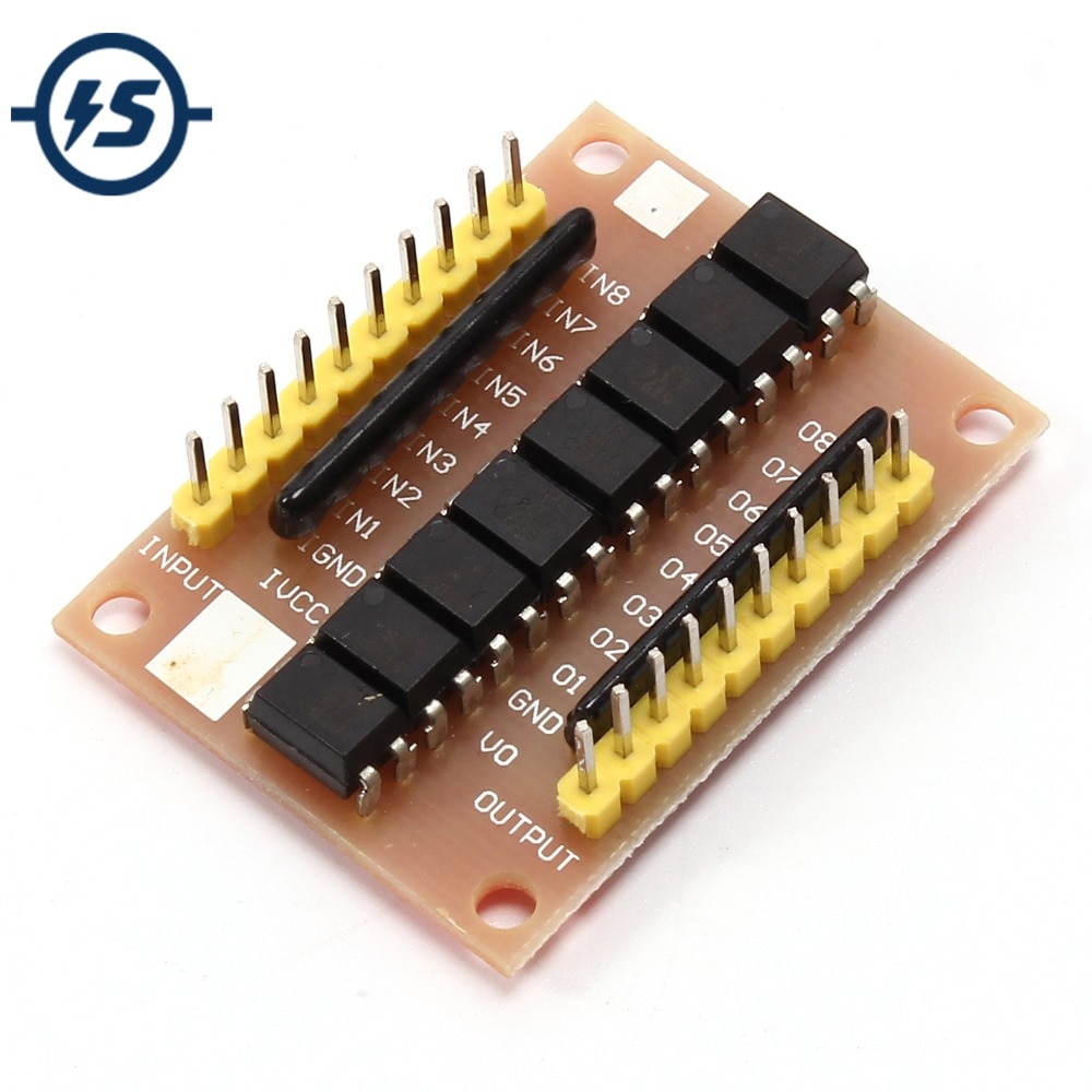 По схеме :) . IN1-IN8 - входы, подаёшь 5-12 вольт без ограничительных резисторов (3.3V тоже должны сработать, но медленнее; 24 вольта предел). OUT1-OUT8 - выходы, без инверсии. VO - питание выходов, подаёшь 3-24 вольта (скока тебе ннада ;) , до 35 вольт по даташиту )