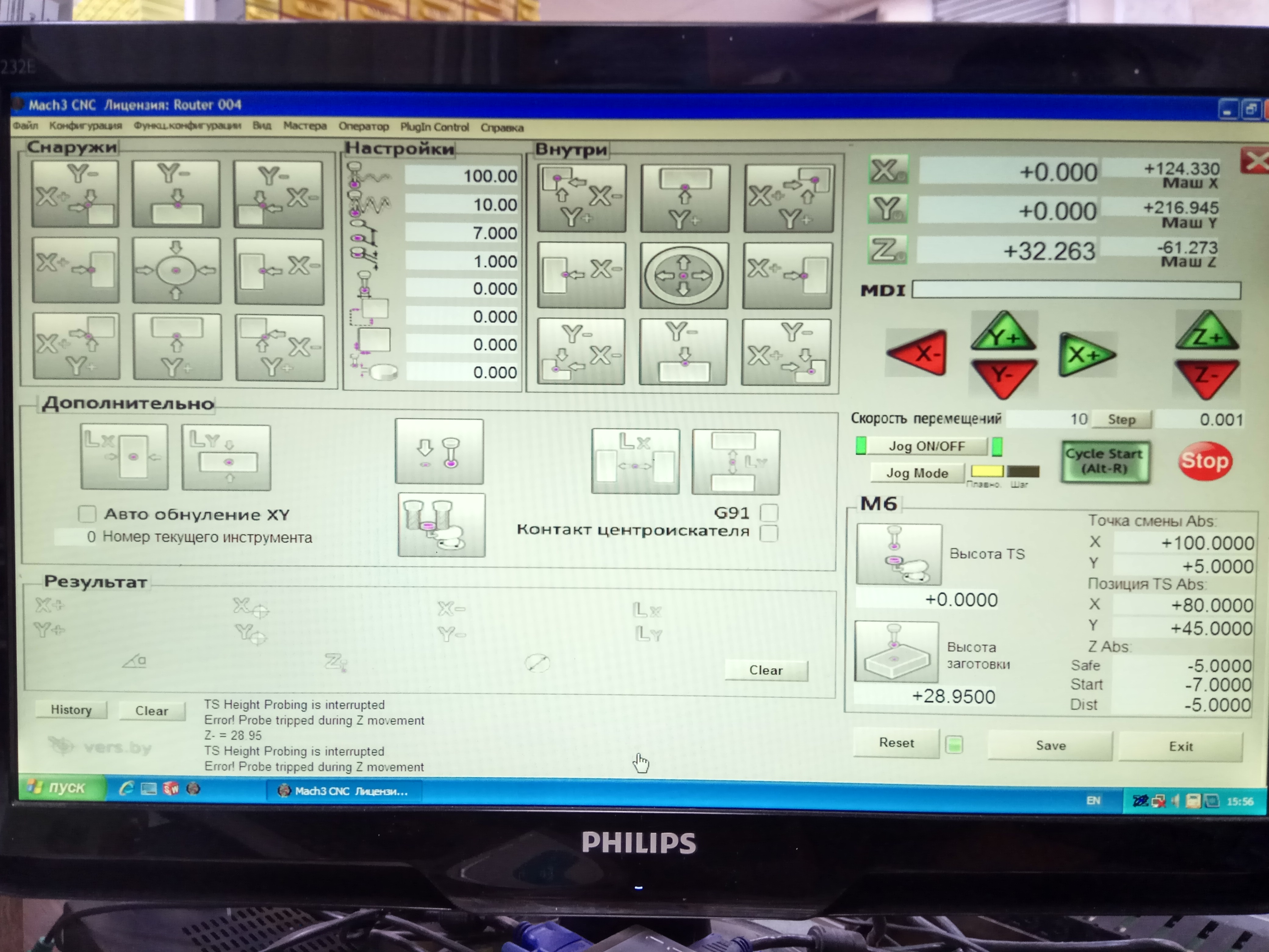 Дальше попробовал после этих экспериментов (после сброса) нажать кнопку высота TS . Предварительно задал значение Safe -20 , Start -5 и Dist -5( с минусом т.к. писал у меня ноль вверху а внизу у стола -100) , а так же координаты XY где стоит датчик .Ось Z поднялась до высоты в -20 и остановилась. Дальше ни чего не происходило. Не было последующего перемещения в координаты где стоит датчик инструмента. Или в ручном режиме это не работает , а только по М06 из программы?