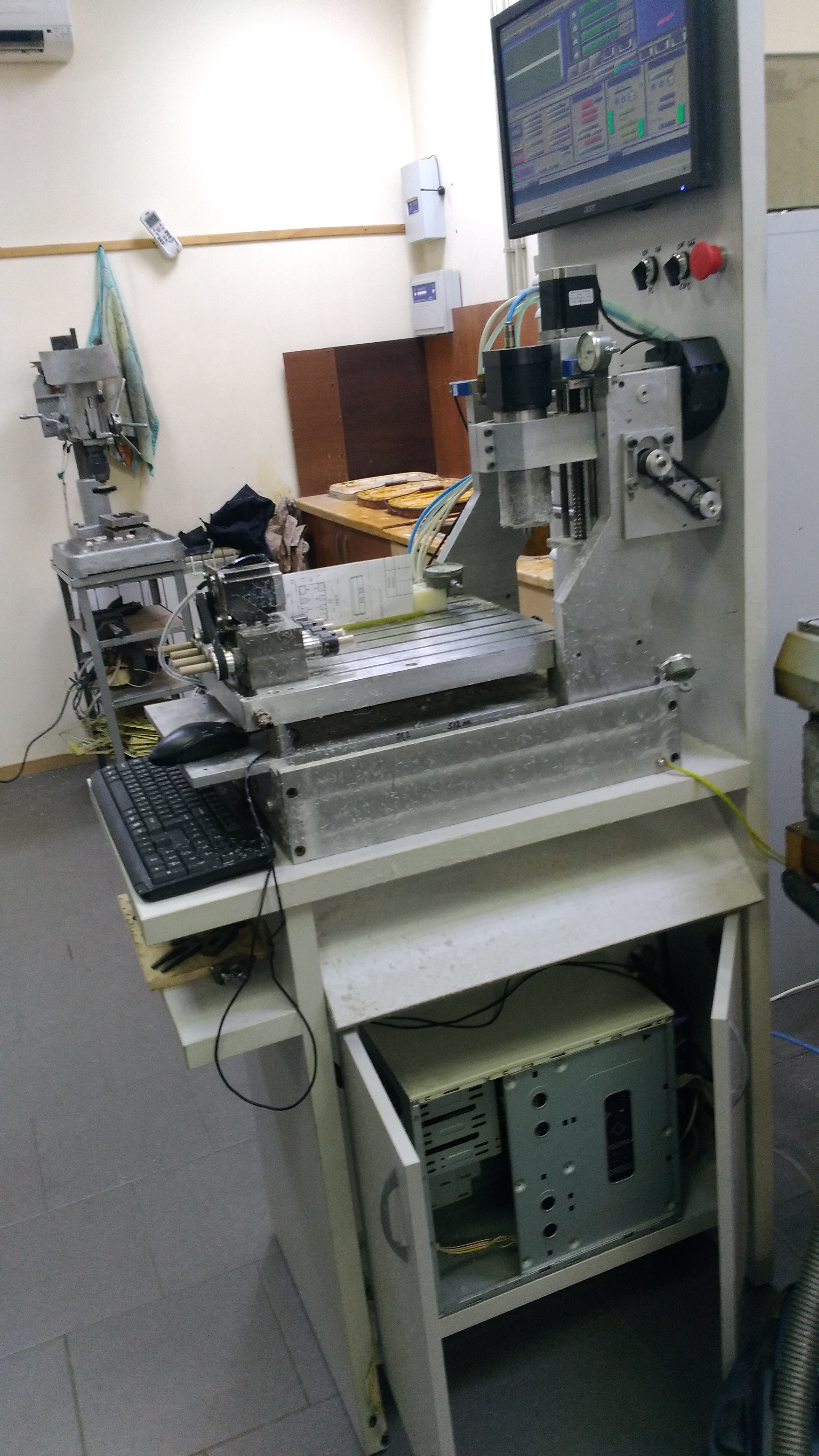 Станок управляется MACH3, где уже написаны скрипты автоматической смены инструмента, а также установки нулей поворотных осей. Оси выверены с высокой точностью 0.01мм.