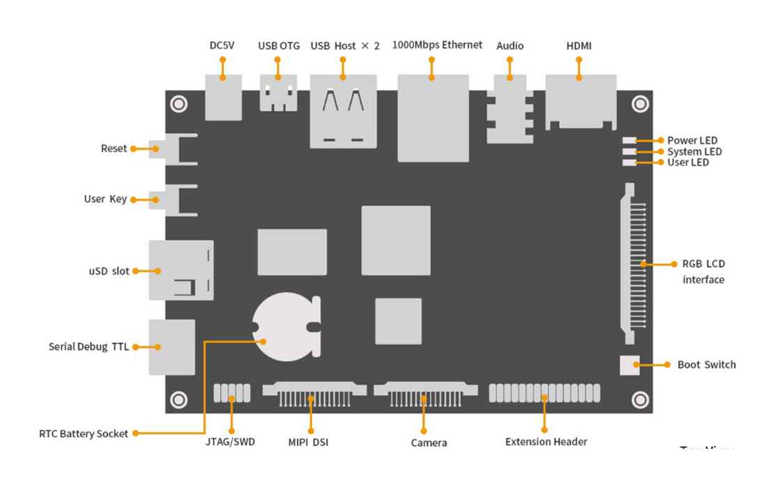 На борту макетки прикручены - 512 Мб ОЗУ, флэшка на 4 Гб, HDMI выход, гигабитный Ethernet, слот MicroSD, два USB 2.0, микро USB, аудио 3.5мм, кроватка для батарейки, QSPI флэшка, гребёнка на 30 пинов и шлейфовые разъёмчики для подключения камеры и разных дисплеев.
