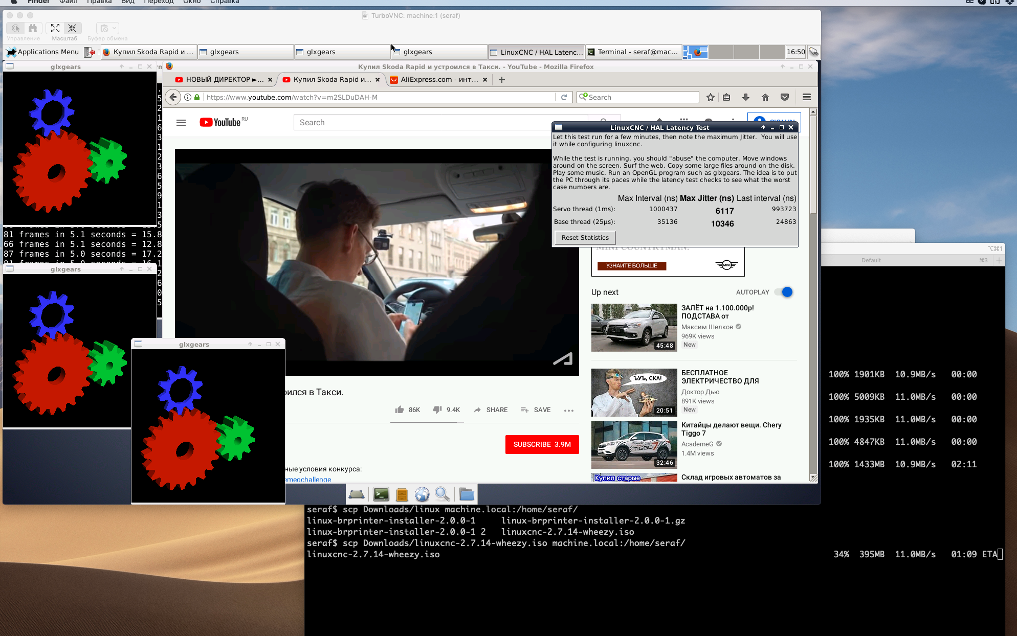 3. Установил все с офф. образа где уже установлен и собран LinuxCNC (debian wheezy там кажется и старая версия LinuxCNC + RTAI). И о чудо джиттер оказался до 15к при слабой загрузке (особо грузить не чем было, даже glxgears не работало почему-то). Сетевая не завелась, вайфая там вообще не было. Собрал модуль для сетевой, все стало и завелось. Тут то и ждало огорчение: при включении любимого ютьюба в какой-то момент джиттер подпрыгивает до 50к).