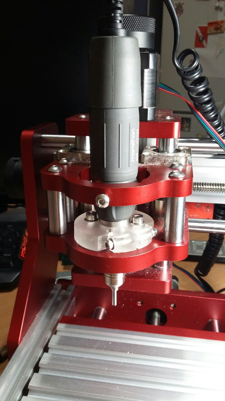 Да, для воска вполне хватает этого. Данная модель специально сделана под фрезер (на фото она слева) и этой точки крепления вполне достаточно. ЧПУ Стриж-2М (для работы по воску) последние модели как раз на этих маратонах давно и успешно трудятся. Переходник сначала вырезал у знакомого на лазере, но он режет не точно и дает конус, поэтому посадочное отверстие делали чуть меньше. Потом аккуратно зажав в токарнике прошли чуть сторону прилегающую к базе станка и не вынимая из патрона было проточено посадочное отверстие под плотную посадку шпинделя. Все это для соблюдения необходимой перпендикулярности шпинделя. Остальное... прорезь для стяжки и отверстие под стягивающий винт, на руках. Так то хотел резать все на своем станке 1310, но через знакомого получилось оперативнее. Пока нужно понимание, так сделал или нет. Скорее придется делать иначе. Сейчас, учитывая новый шпиндель и переходник я поднялся над рабочим столиком на лишних пару сантиметров. И скорее придется ставить переходник снизу площадки на которой он сейчас, а не сверху. Но этот тогда уже не годится, будут изменения...