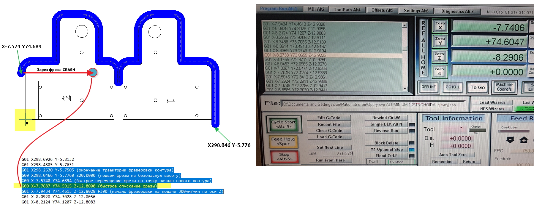 И опять, после прохода контура (время одного прохода - 1 час), при переезде на начало контура для прохождения последнего прохода, опять фреза тыкается в туже дырку, что и в первый раз!!! и опять CRASH
