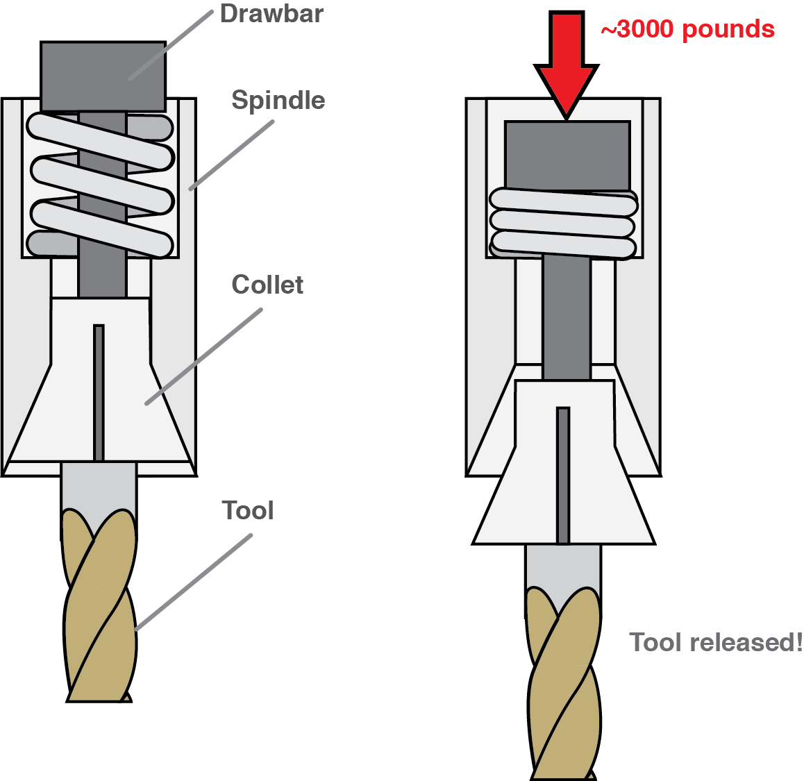 Сверловка под шарики не сквозная, там маленькая ступенька в конце. Подшипники шпинделя спокойно держат нагрузку смены инструмента, ничего никуда не выйдет.