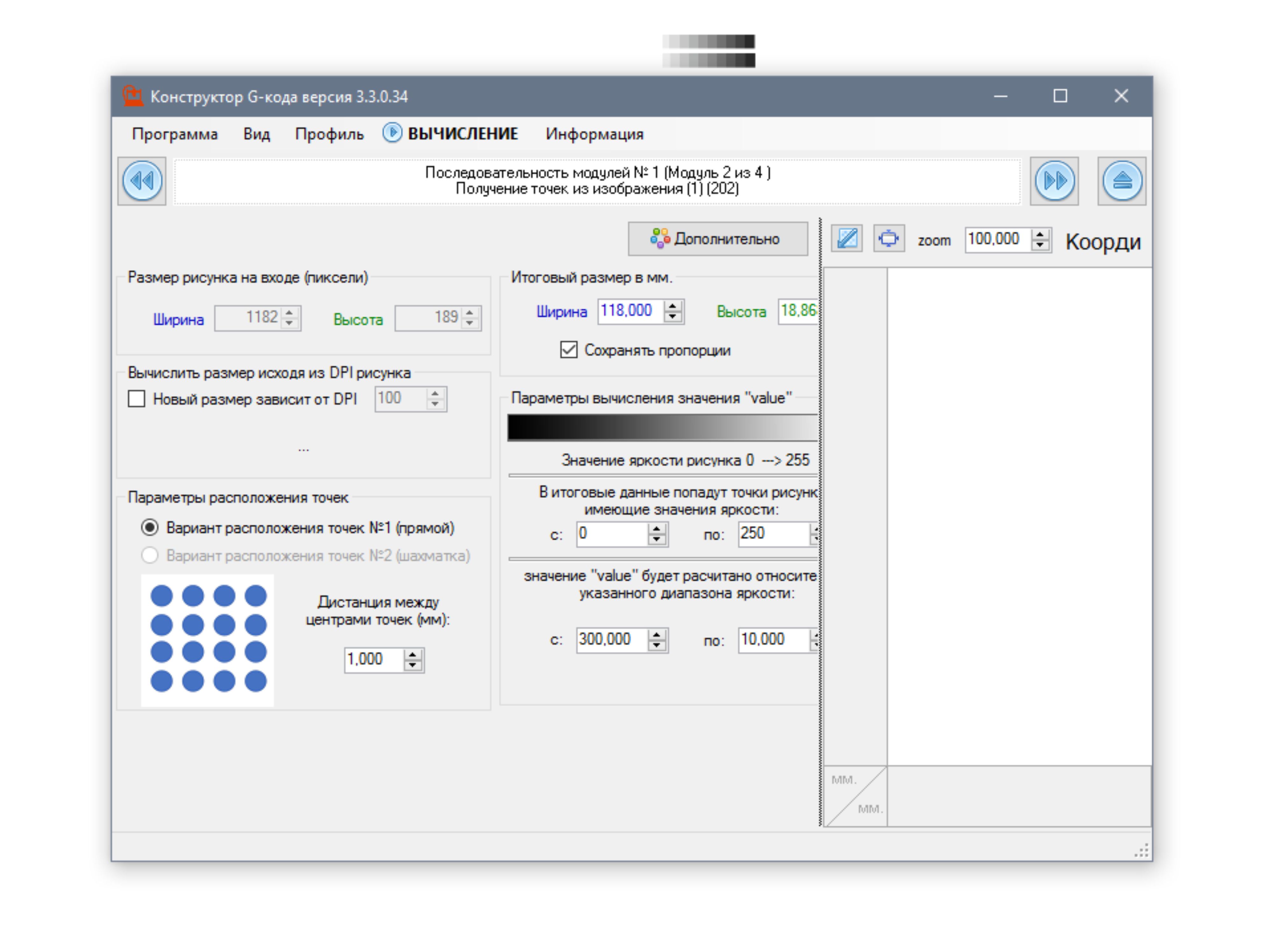 Создал профиль для растрирования графики, сначала загружаю картинку модулем загрузки, преобразую её в градации серого, затем перехожу к модулю получения точек и в результате вычислений ничего не происходит. Если нажать "повторно загрузить данные" появляются размеры, но на окне предпросмотра всё равно пусто. Также пусто и в модуле модификации векторов, там даже размеры не отображаются и в результате генерится пустой код.