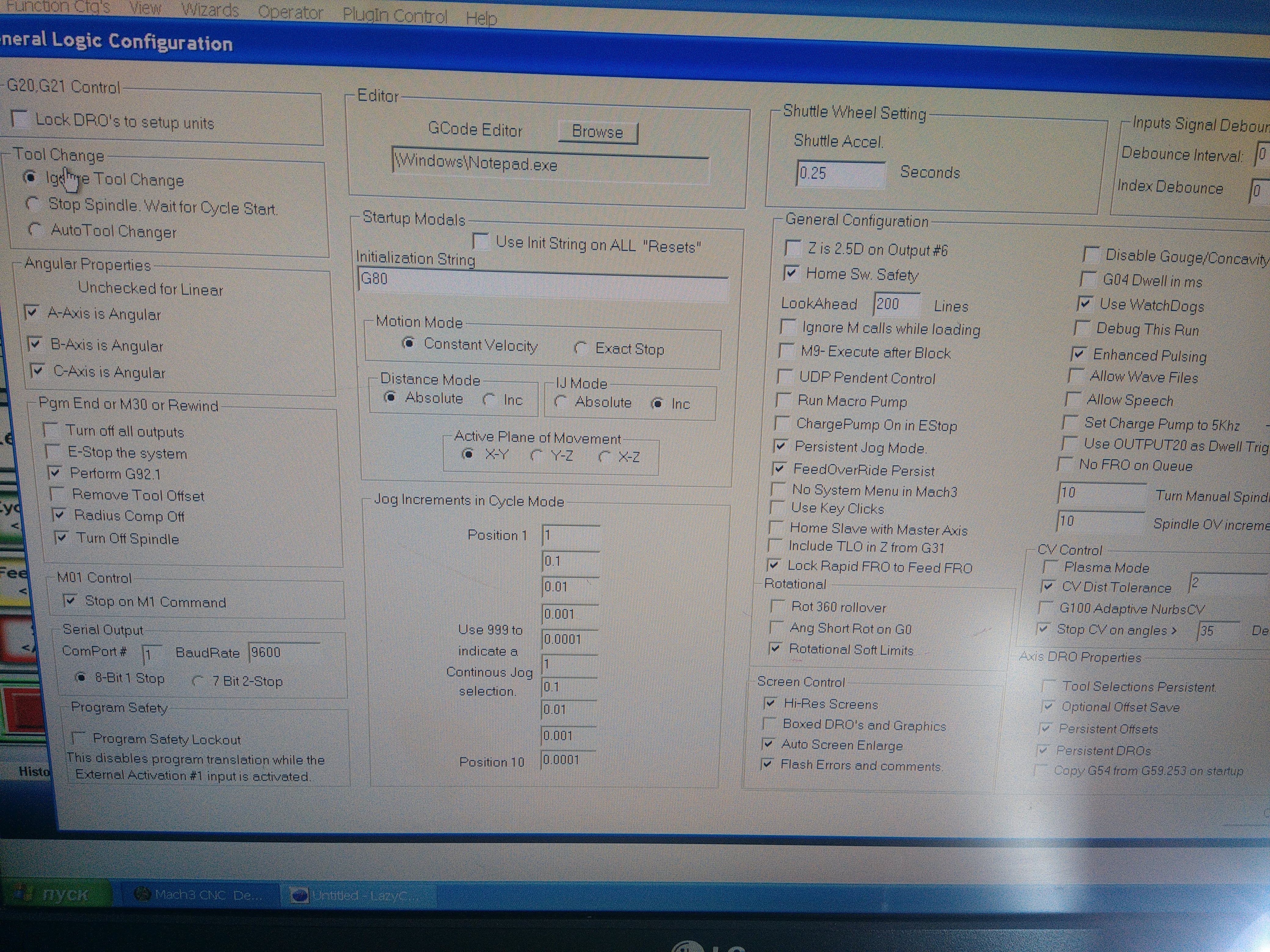 Добрый день.Помогите советом, мастера!!!Не могу настроить частотник INNOVERT для работы со шпинделем GDZ-65-800A.Прописал такие настройки: Pb00-400; Pb01-1; Pb02-1;Pb05-400;Pb06-0;Pb07-5;Pb08-5;Pb09-220;Pb10-400;Pb11-100;Pb12-220;Pb13-55;Pb14-100;PC10-5;PC11-40;PC12-6000; При команде М3 двигатель работае в пол "силы",обороты не регулируются из MACH3.При команде М4 замедляется и начинает вращаться с нестабильными оборотами.Подскажите плиз,что я не так прописал..?Я в "теме"недавно,неразобрался с нюансами ещё..)