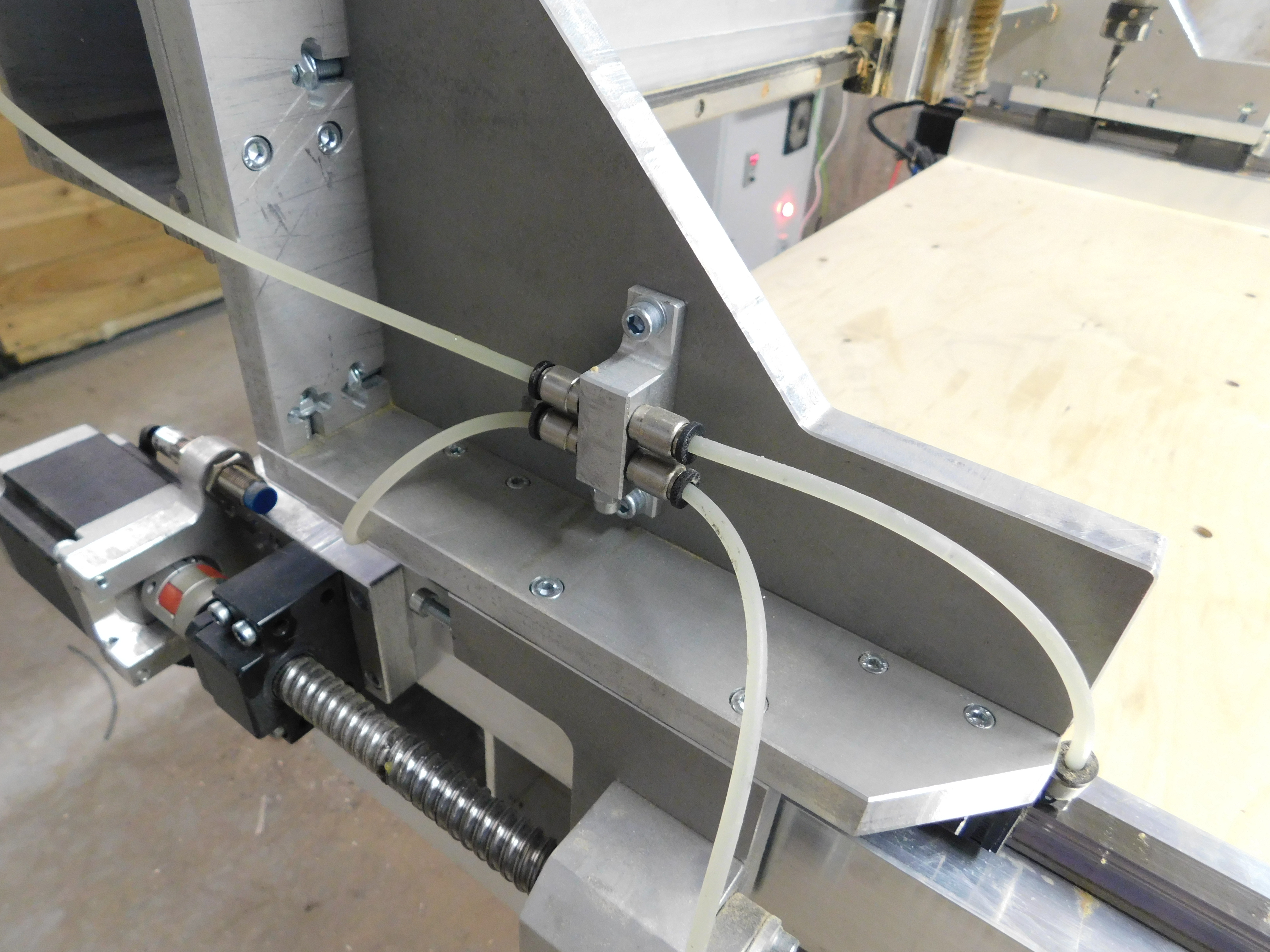 Немного доработал конструктив шприца, чтобы отказаться от лепесткового зажима(из него смазка повсюду лезет). Единственное, что пока не совсем хорошо: смазка доходит до узлов с непостоянной скоростью. Но это, я думаю решаемо, если установить коллектор с регулировкой расходов. Да и к тому же к каждому узлу (их 4шт) сейчас подходит трубка от центрального коллектора, можно её отсоединить и шприцевать прямо туда. Вводы в каретки пришлось делать самодельные,тк с резьбой М4 и с наклоном 90гр не нашлось.