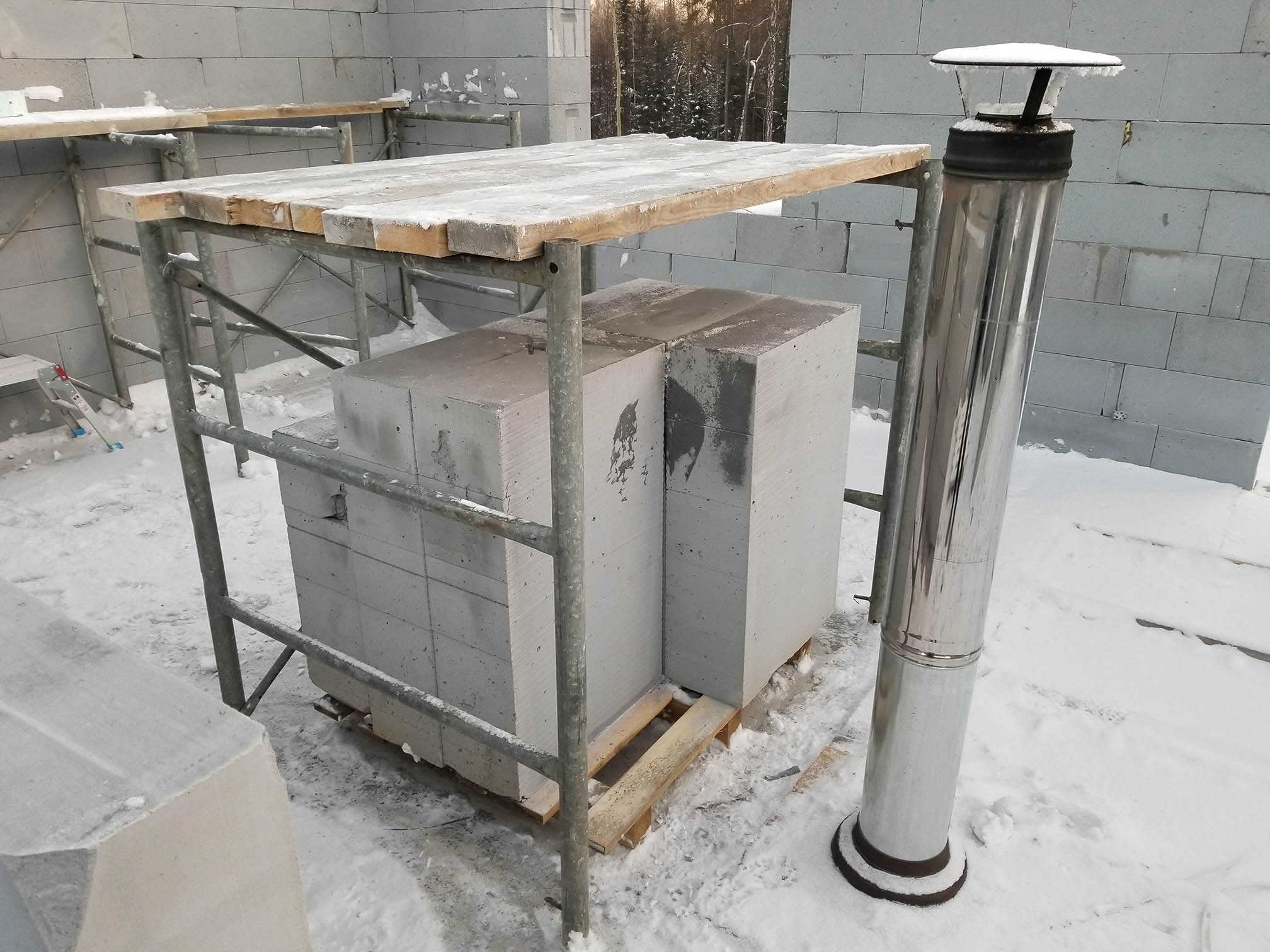 Проблемы зимой были только с тем, что 50% времени я тратил на уборку снега. И очень сложно было разделить смерзшиеся в единую глыбу блоки, сильно промокшие под осенними дождями. Один из поддонов отогревал двое суток, чтобы разделить.