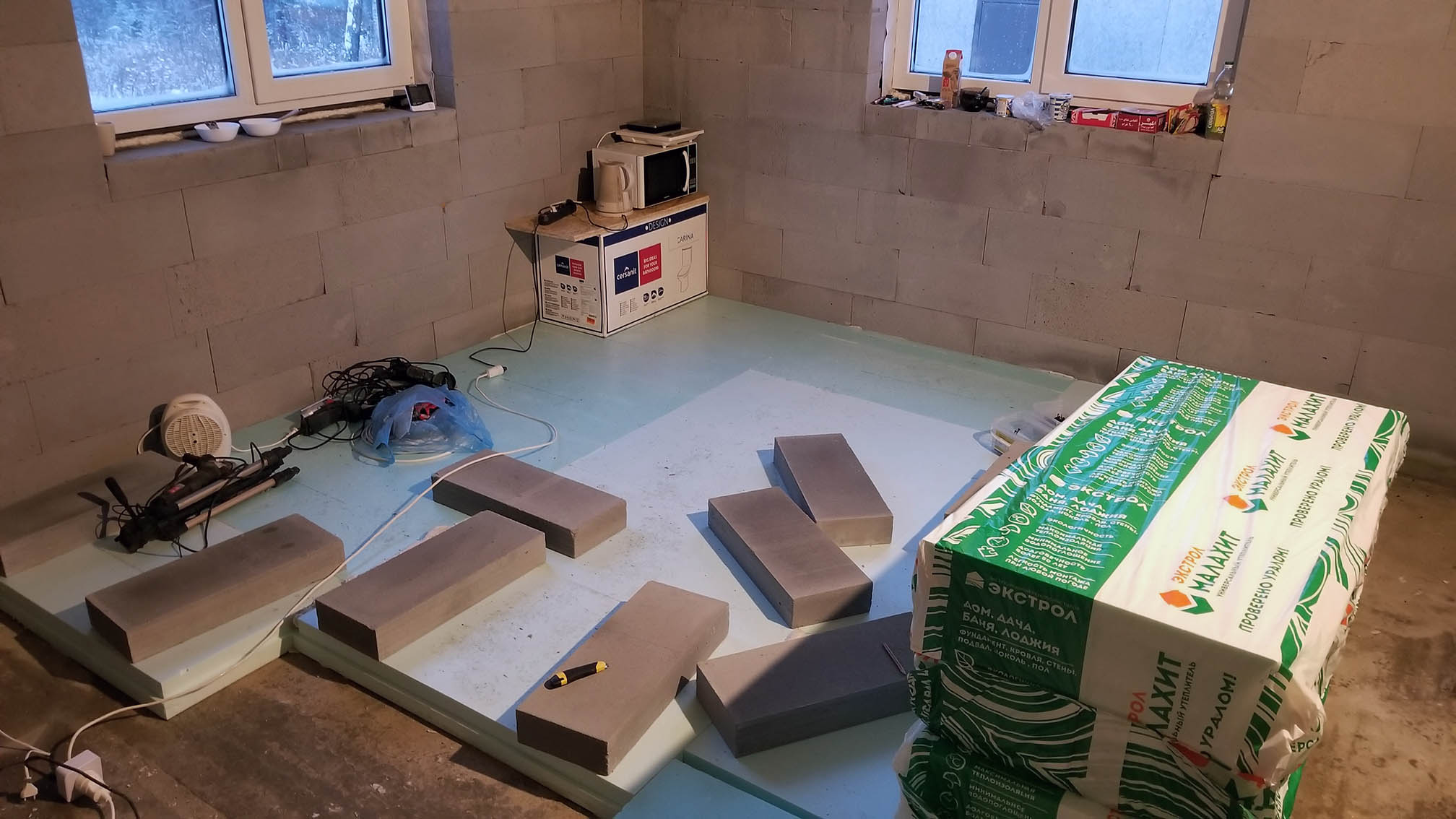 "Крыша" из плит позволила закрыться от снега и уложить утеплитель на перекрытие между этажами. Окна заколотил остатками опалубки. Очередная победа — первый этаж стал теплым!